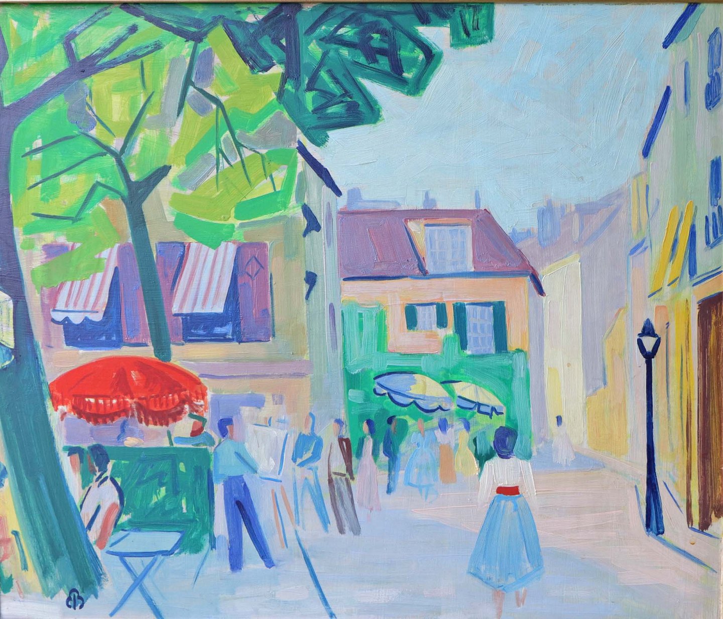 Maleri på plade monteret i lysmalet træramme med motiv af by- og caféliv i pastelfarver.