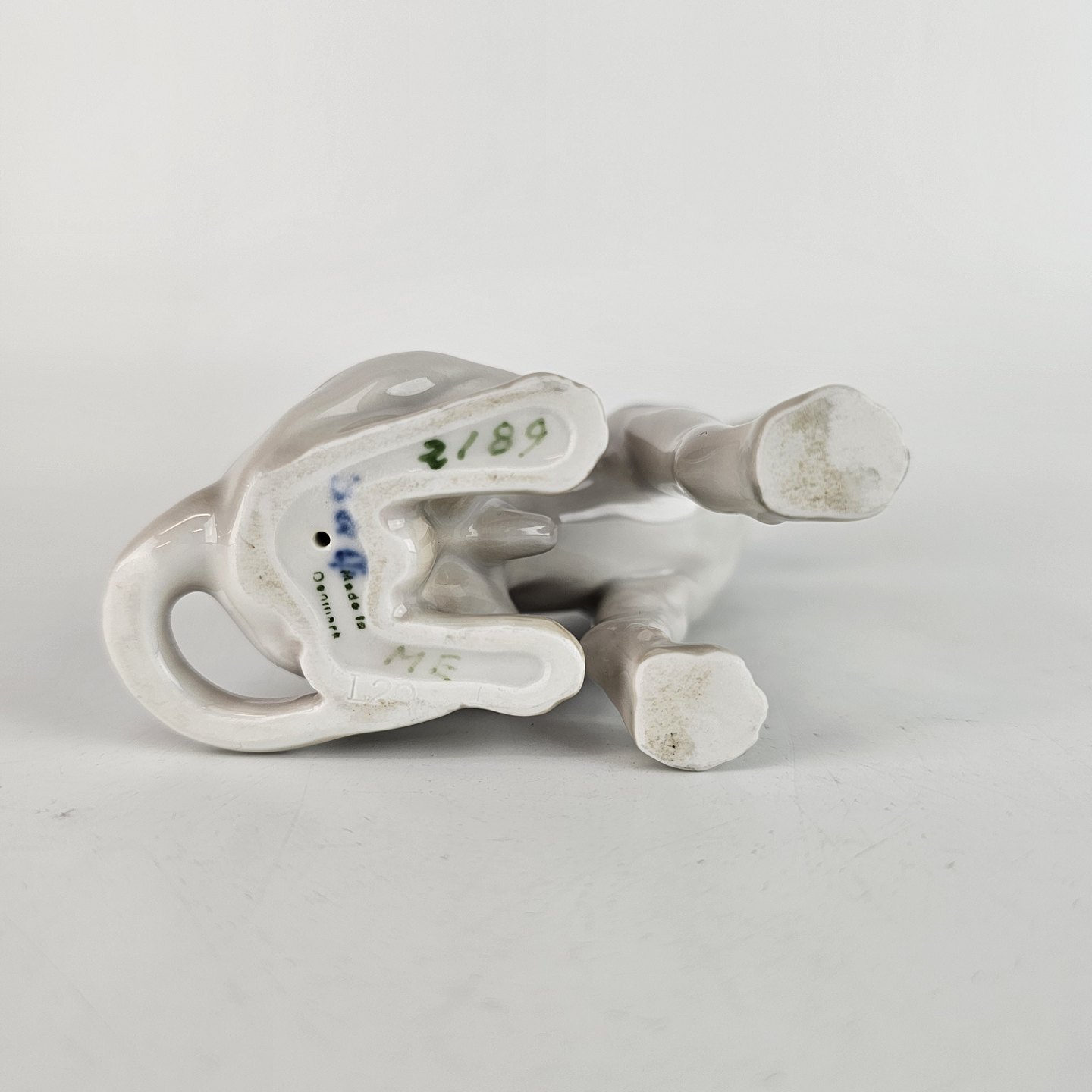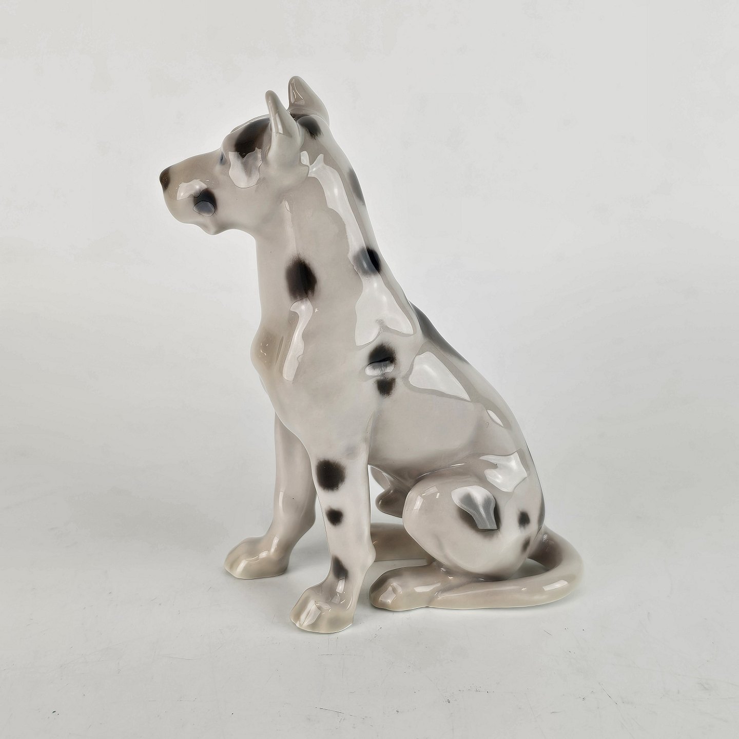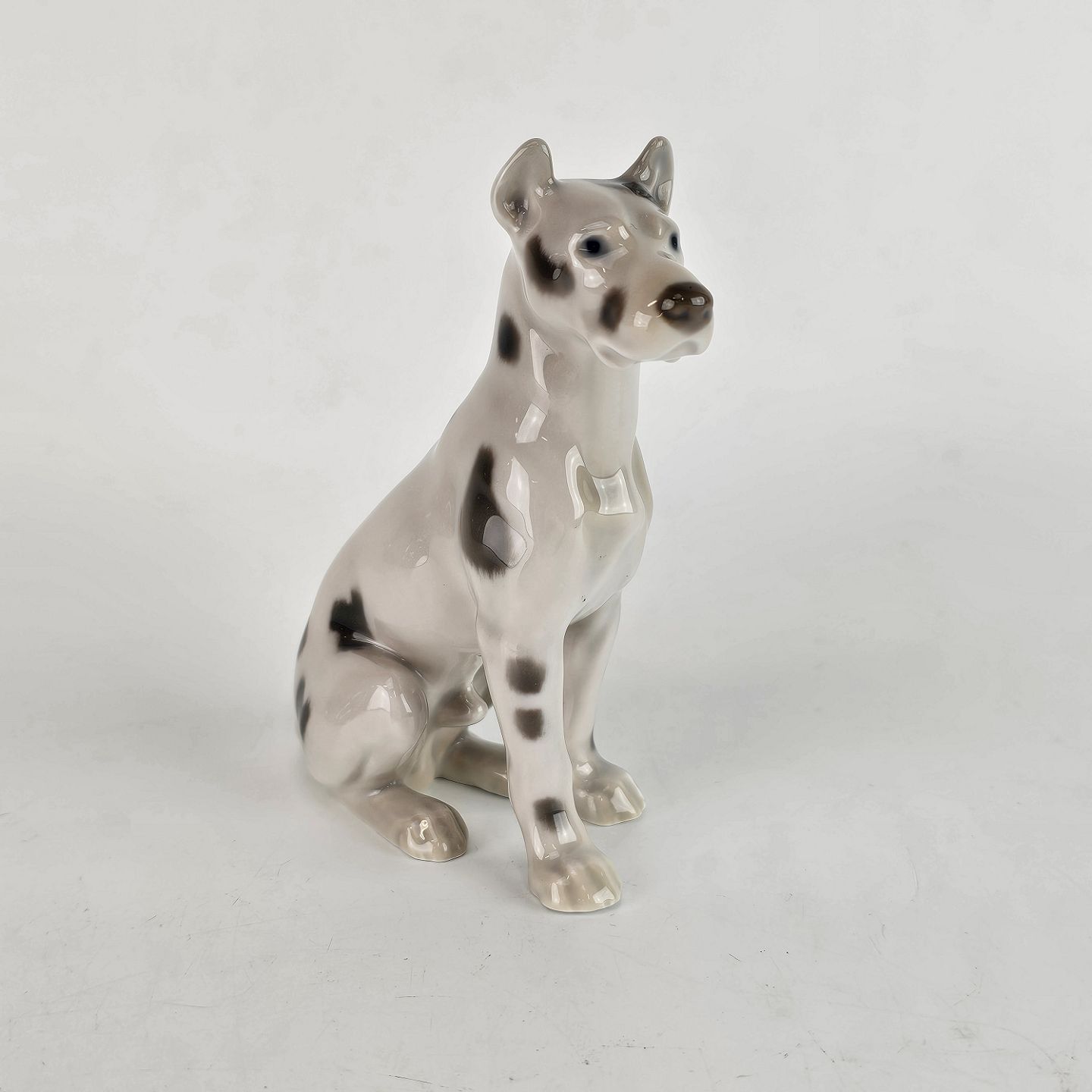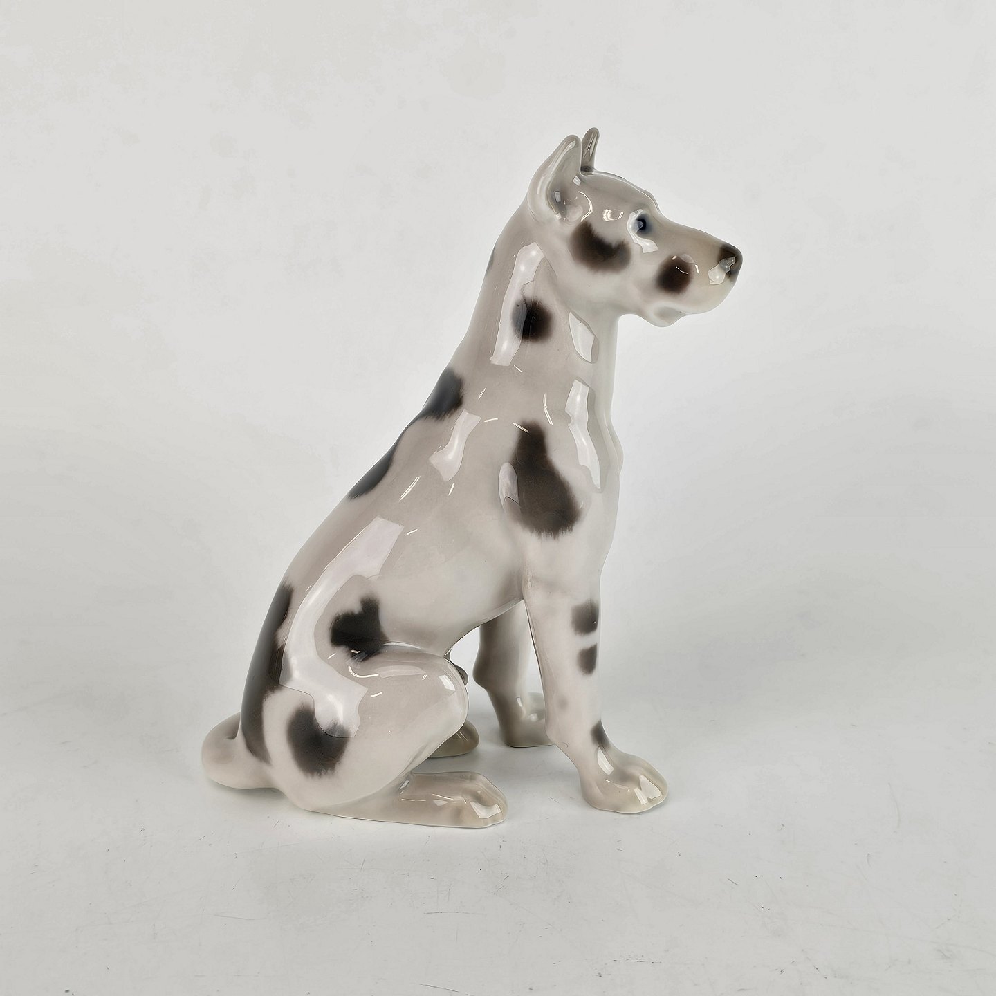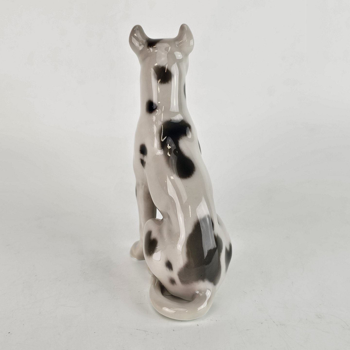 Figur i porcelæn med motiv af en siddende Gran Danois hund med sorte pletter.