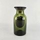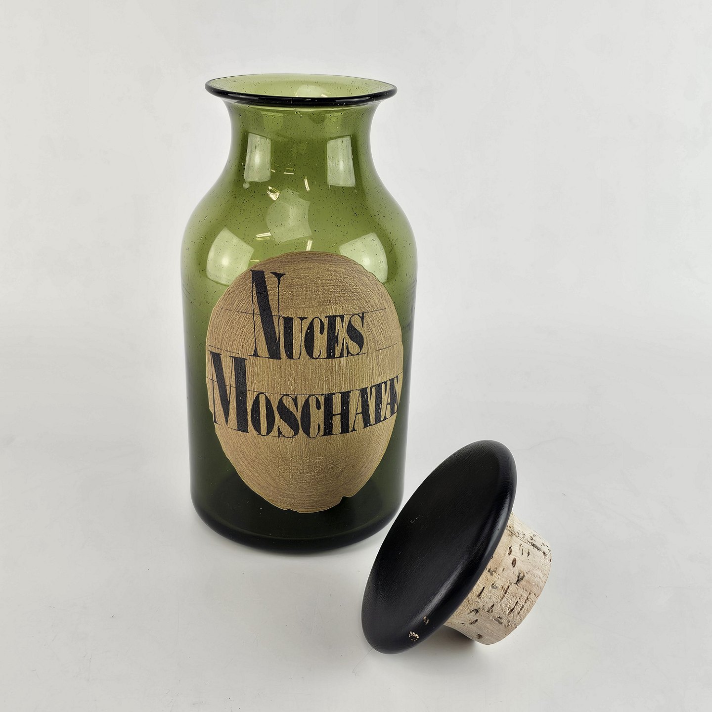 Mørkegrøn apotekerflaske med prop, med teksten Nuces Mochatræ