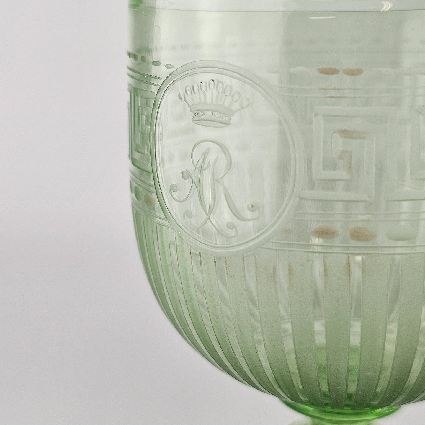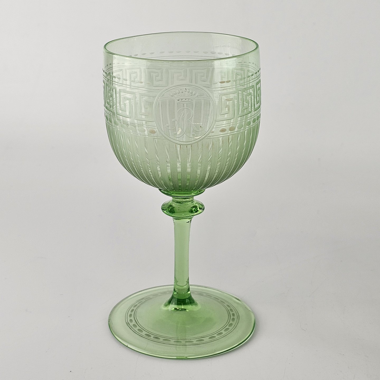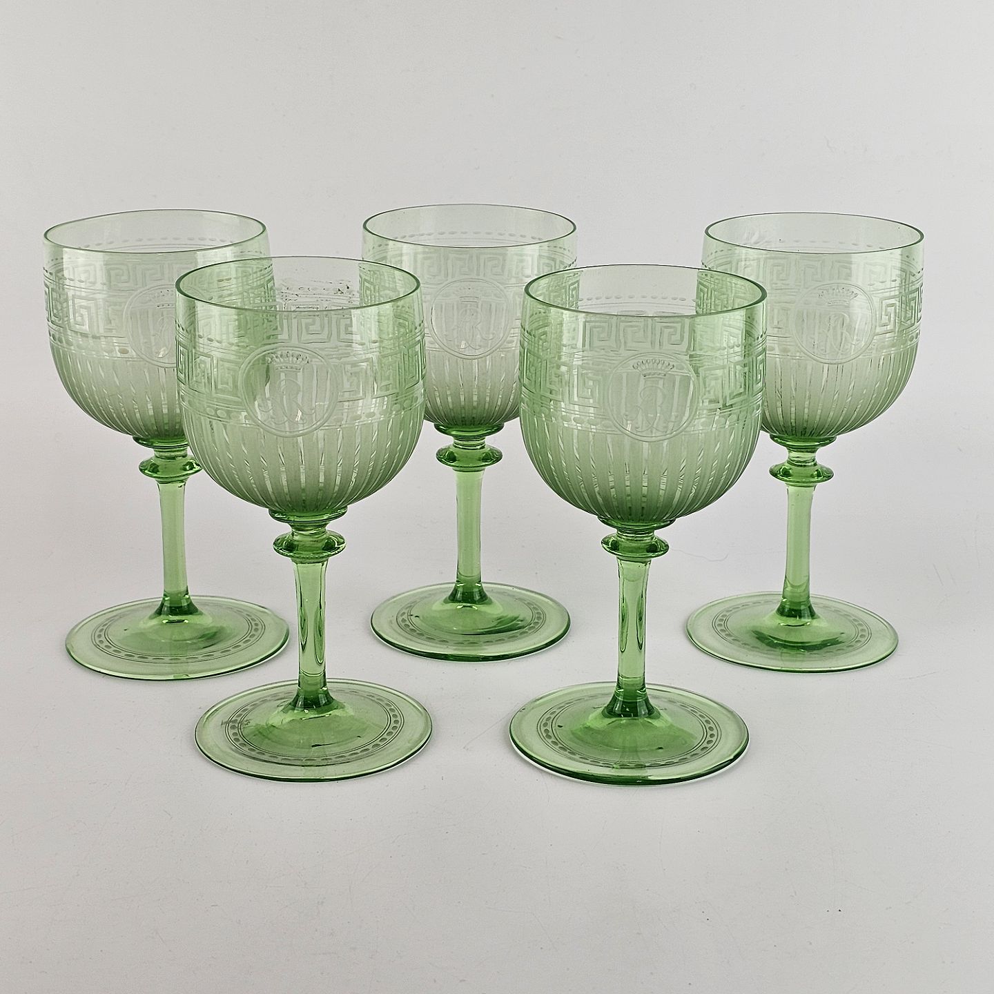 Fem vinglas i grønt glas, med indgraveret adelsmærke AR under krone.