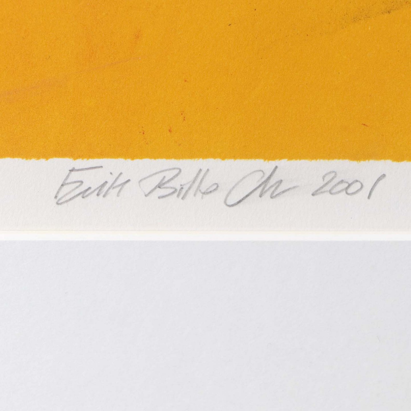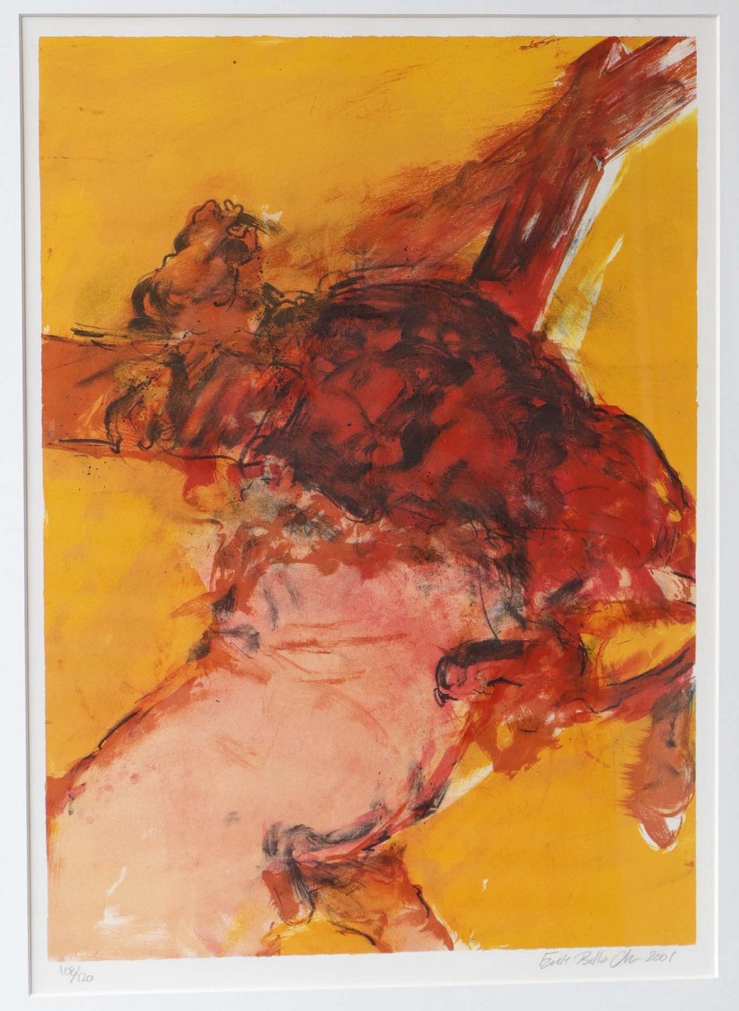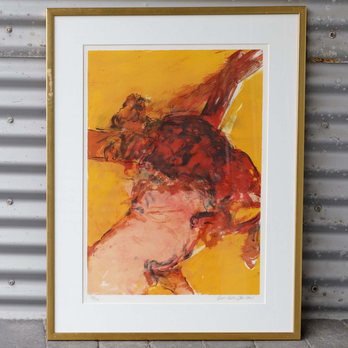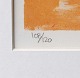 Indrammet litografi med passpartout i guldmalet træramme. Abstrakt composition i orange røde farver. Dateret 2001. Nr. 100 ud af 120 eksemplare.