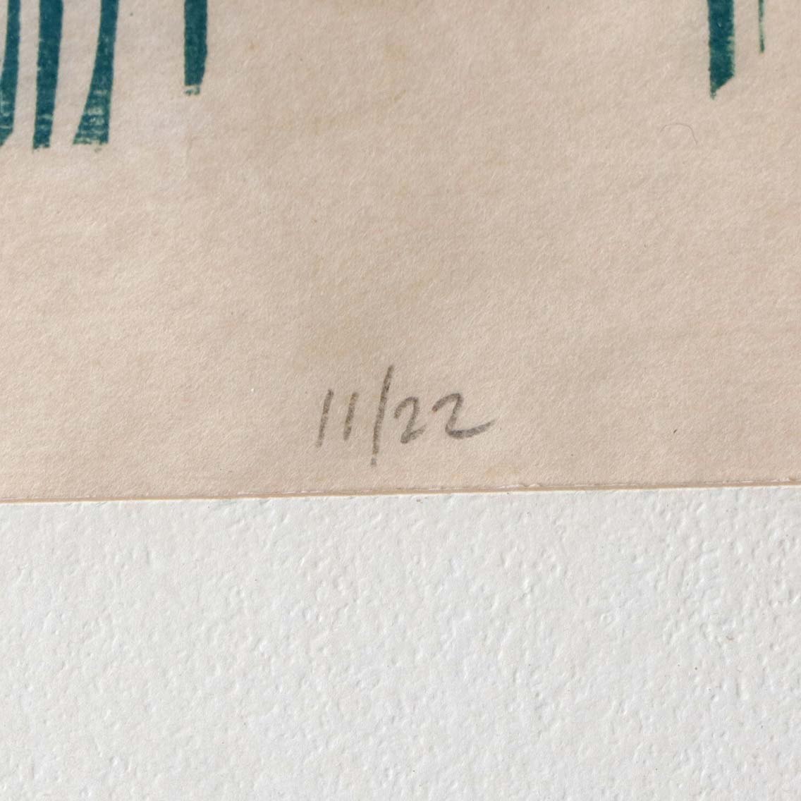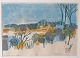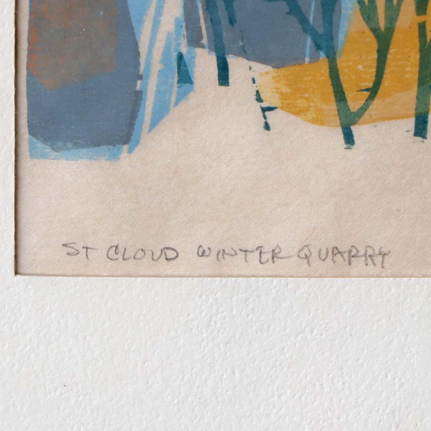 Indrammet litografi med passpartout i grå aluminiumsramme med kunstnerisk fortolking af landskabsområde under titlen St Cloud Winter Quarry. Nr. 11 ud af 22 eksemplare.