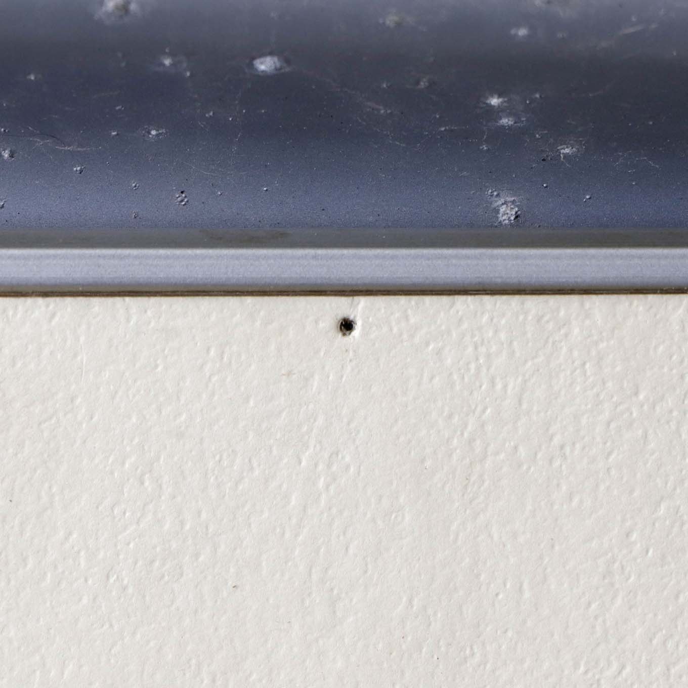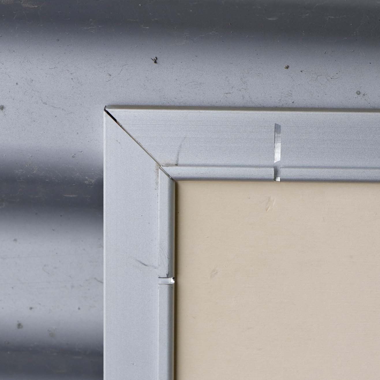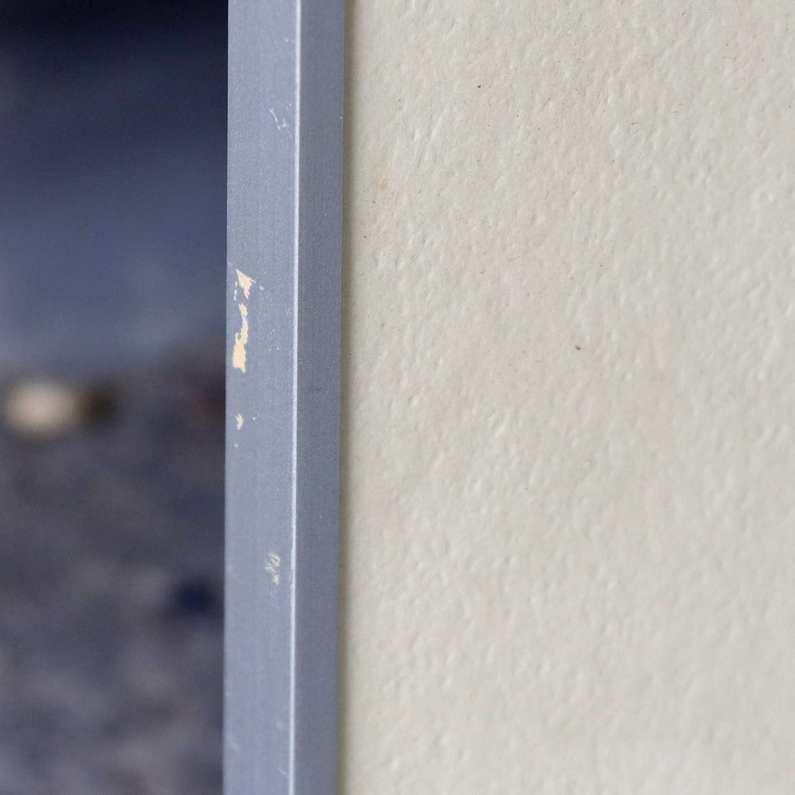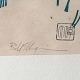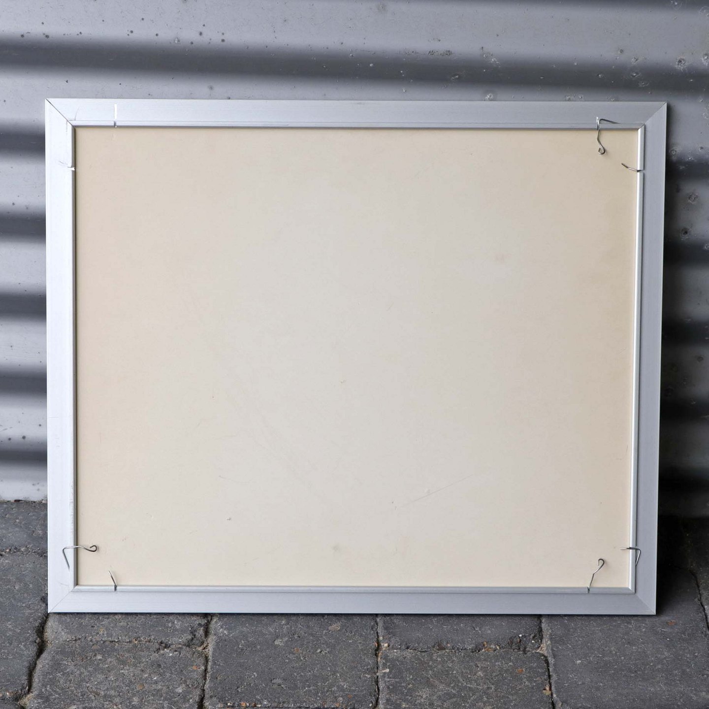 Fremstår med mærker efter tape på rammen, mindre rundt hul i passpartout samt to manglende hasper på bagsiden.