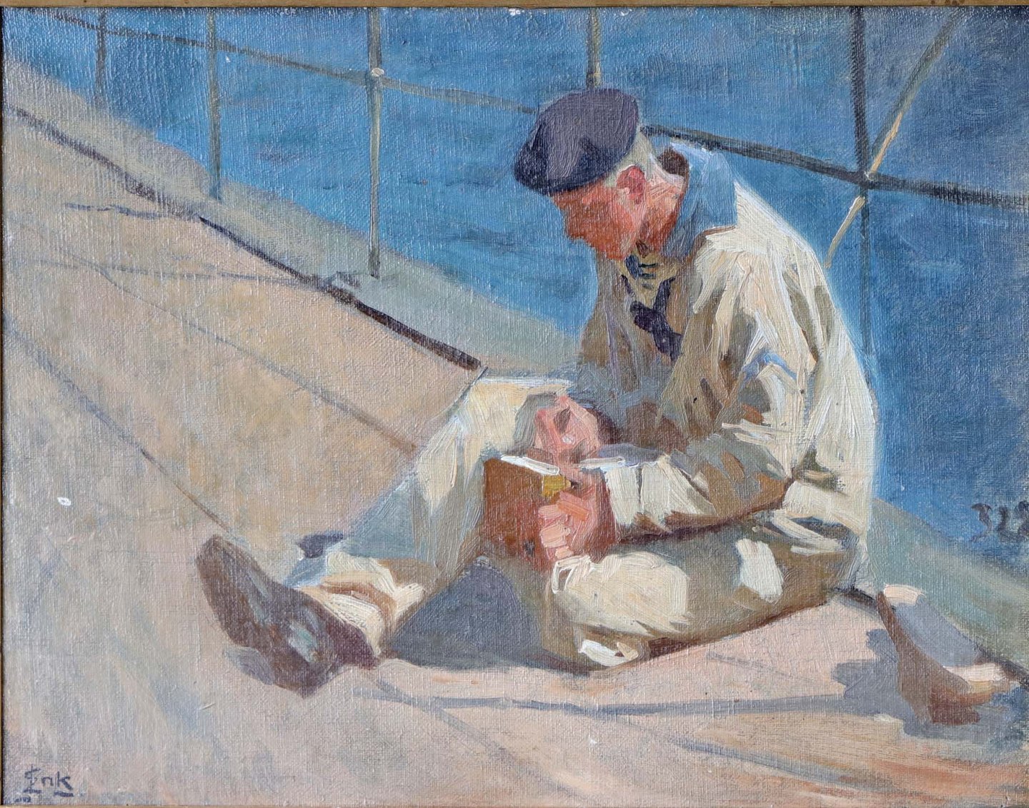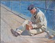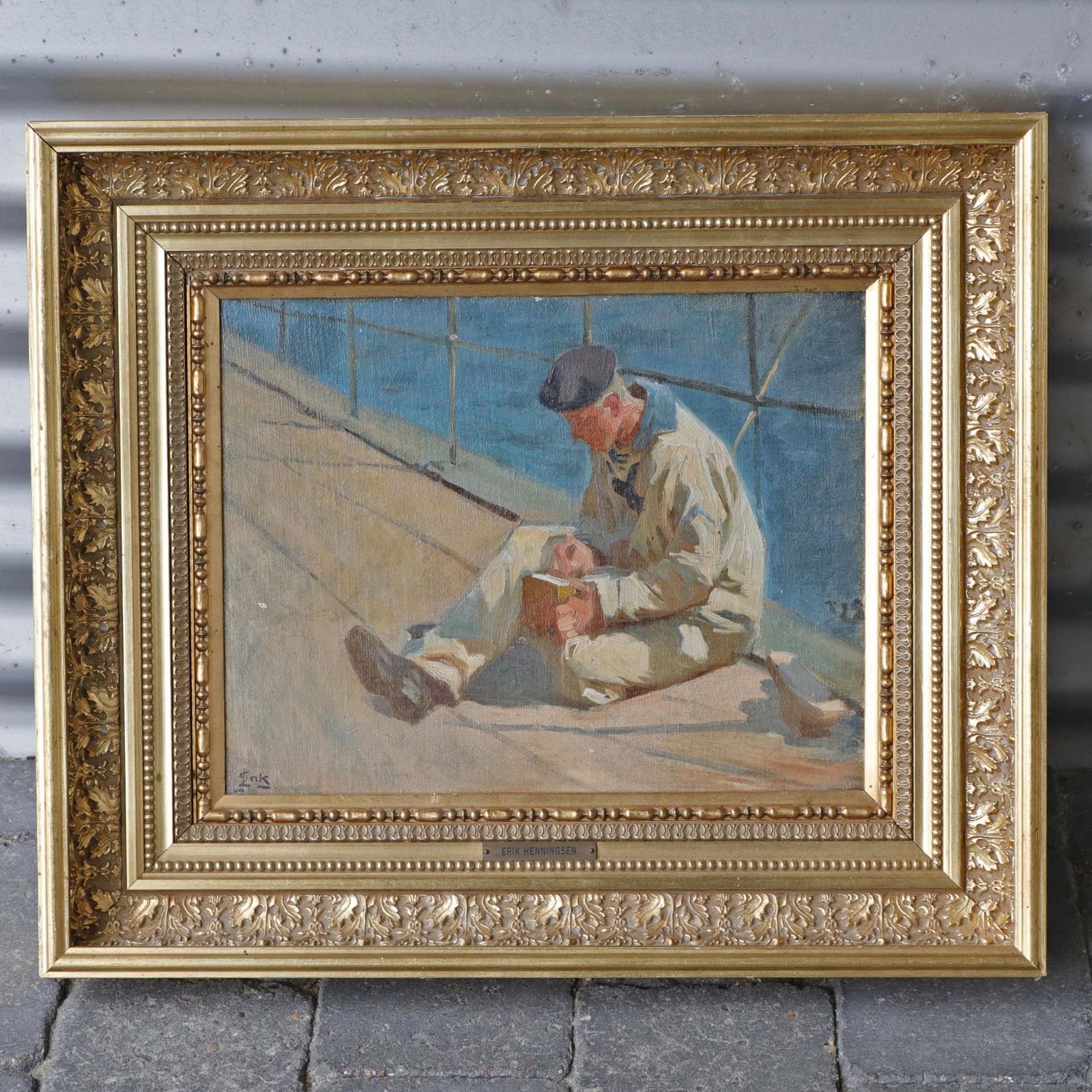 Oliemaleri på plade i dekoreret guldmalet træramme med portræt af matros siddende på skibsdæk.