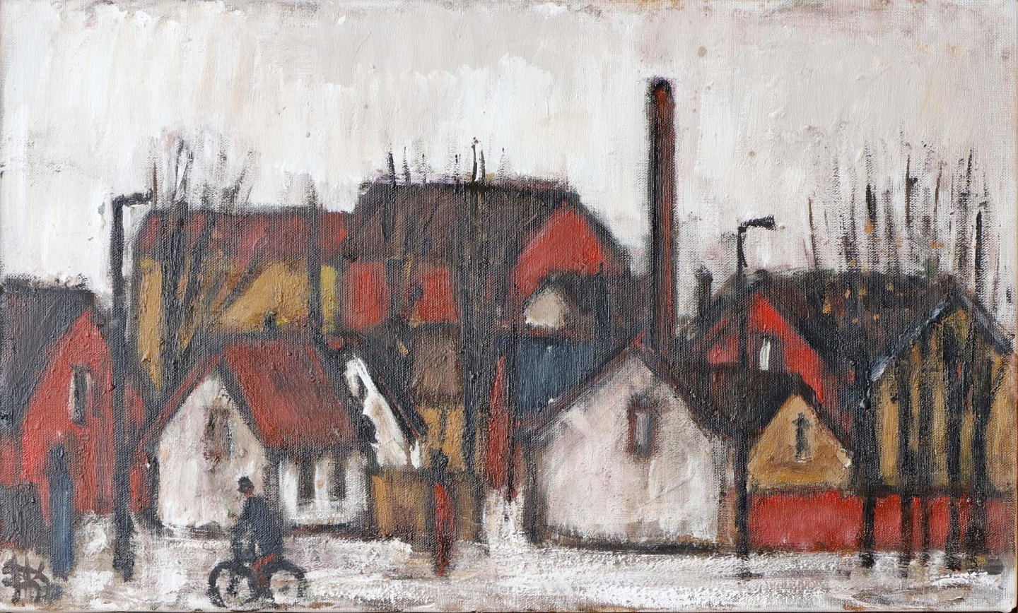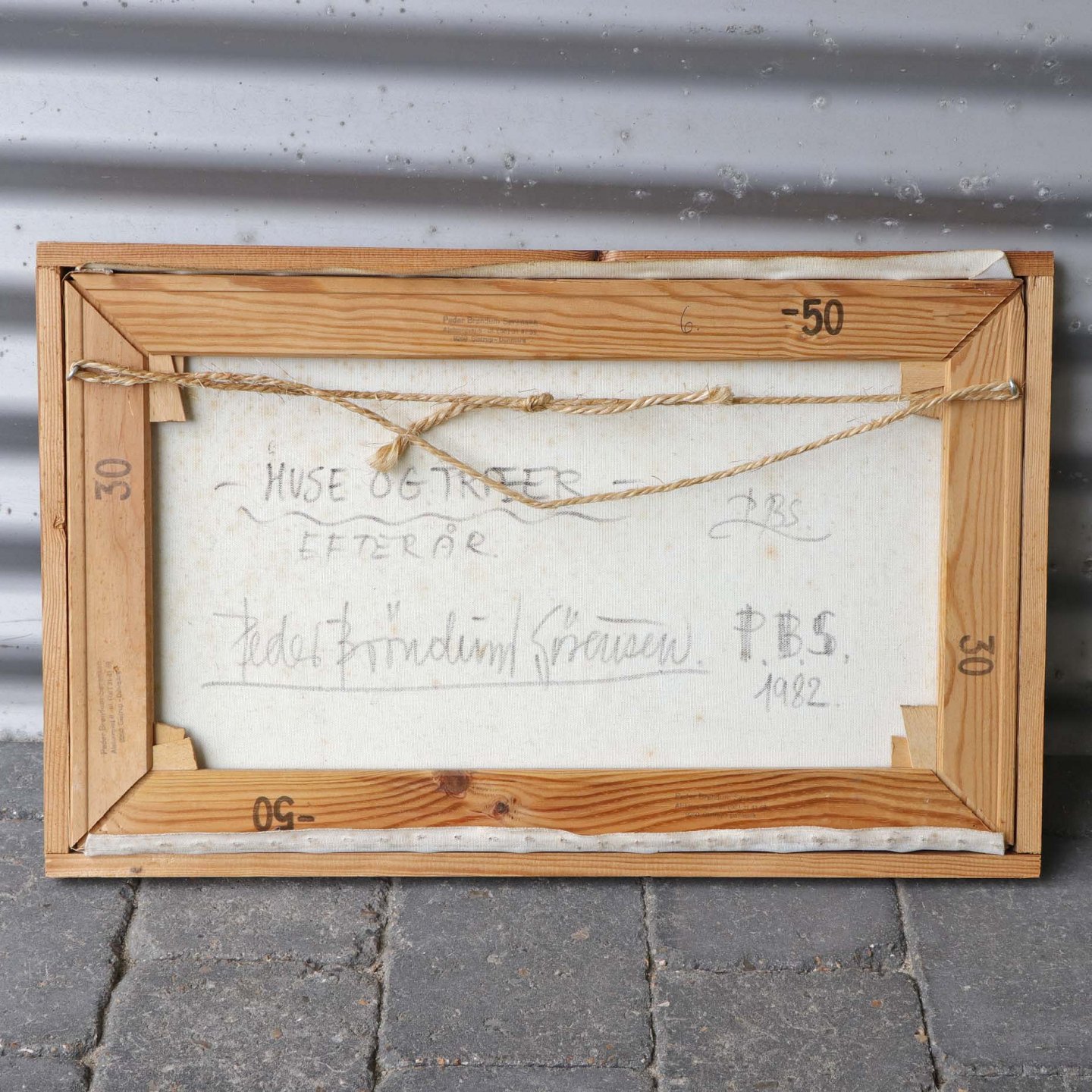 Oliemaleri på lærred i træramme med byskabsmotiv titlen Huse og træer - efterår. Dateret 1982