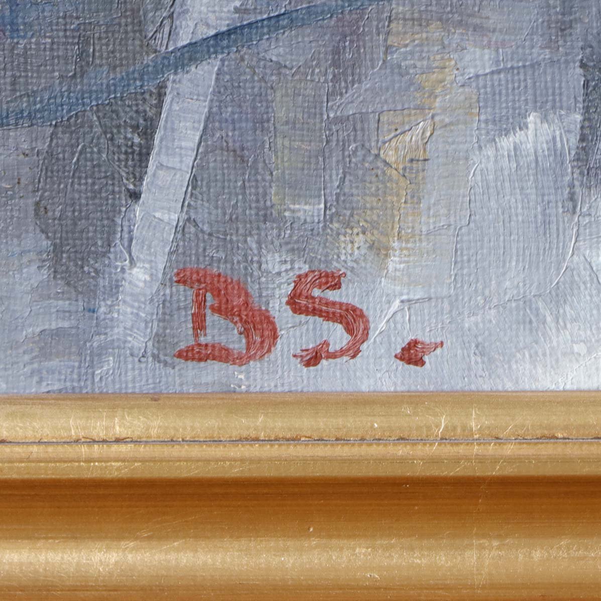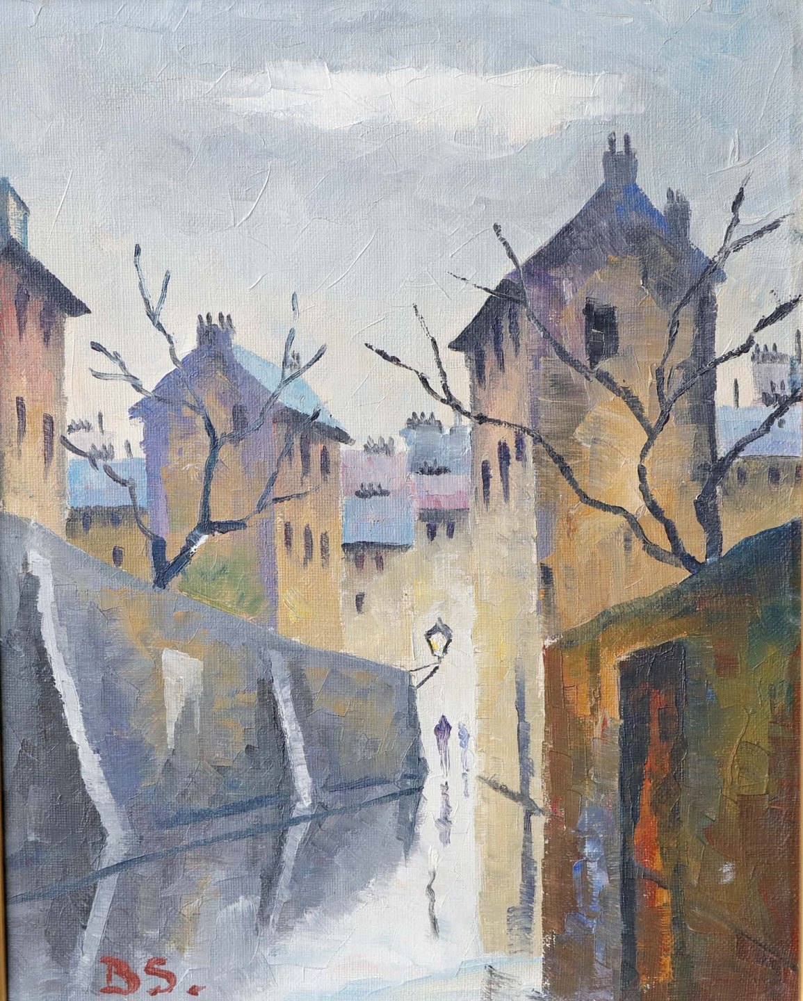 Oliemaleri på lærred i guldmalet træramme med motiv af to mennesker omgivet af ældre bygninger.