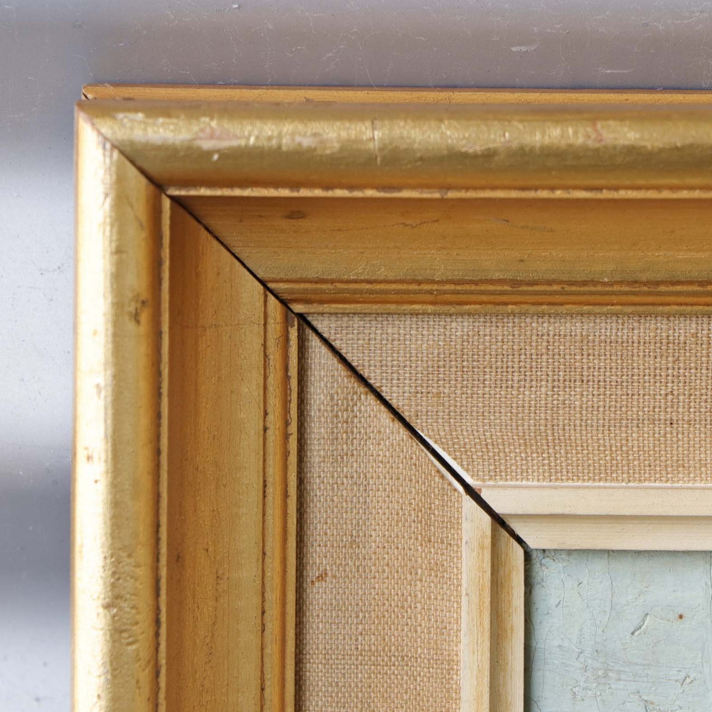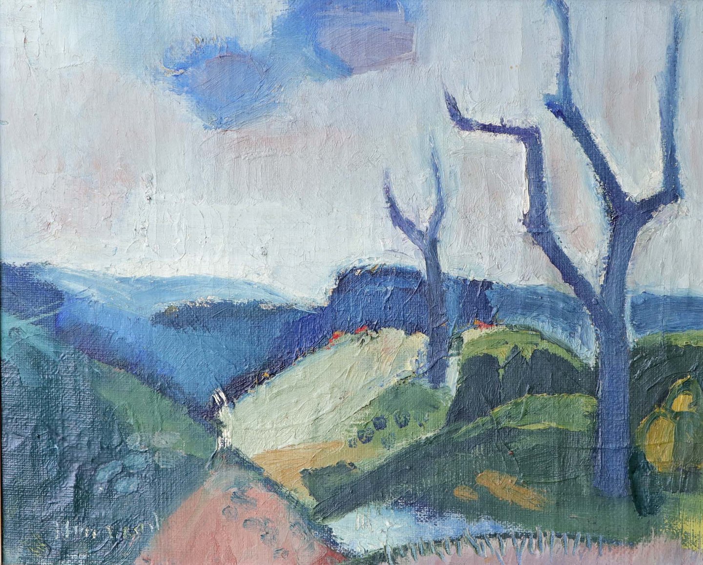Oliemaleri på lærred i guldmalet træramme med landskabsmotiv af nøgne træer i kuperet terræn.