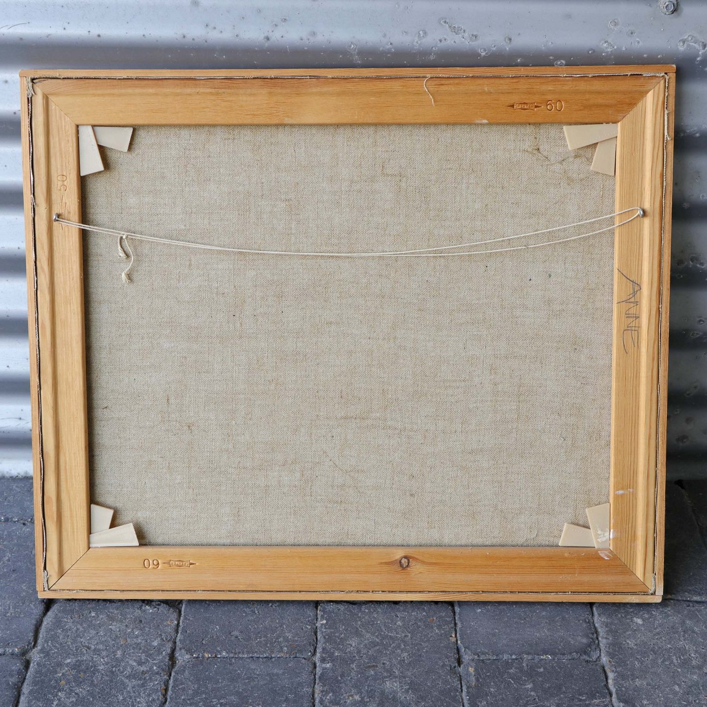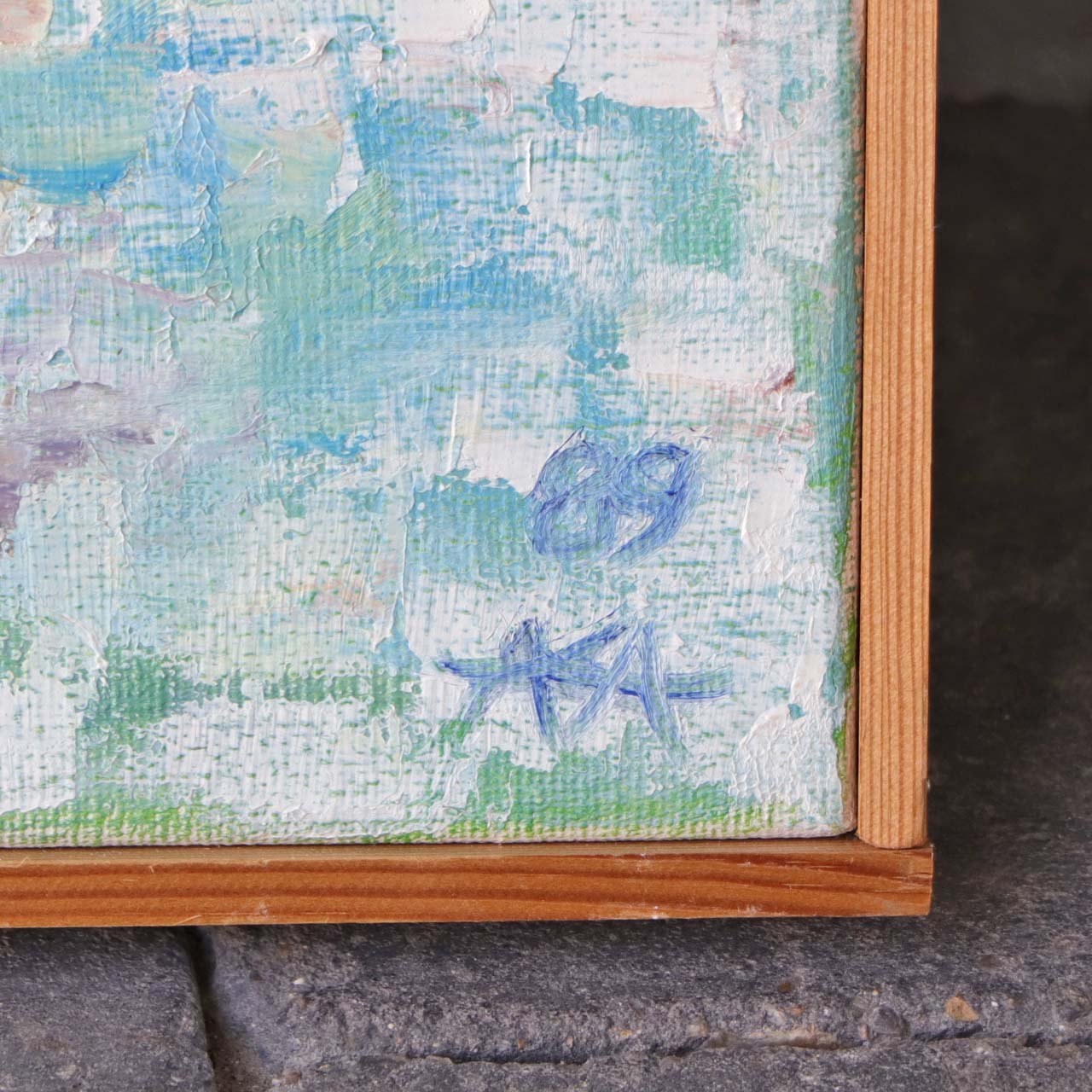Maleri på lærred i fyrtræsramme med abstrakt motiv i pastel faver. Dateret 1989