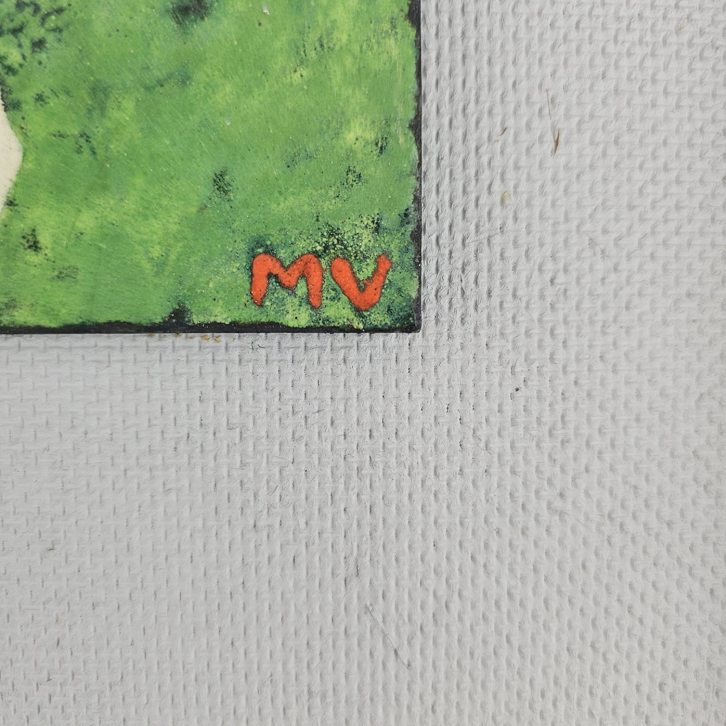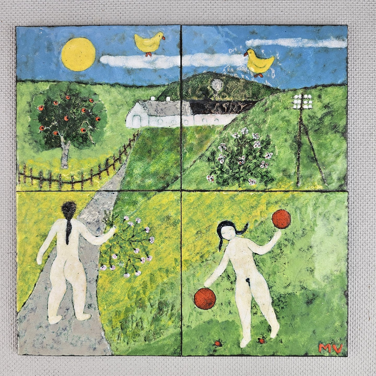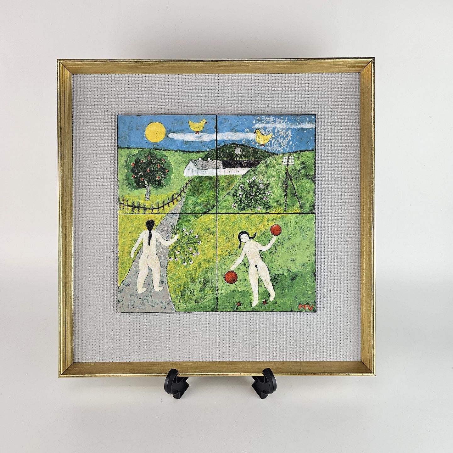 Farverigt Emalje kunst, Sommersol, med motiv af et landskab med en gård, træer og buske og to nøgne mennesker, malet på emalje. Billedet er lavet i perioden 1986-89