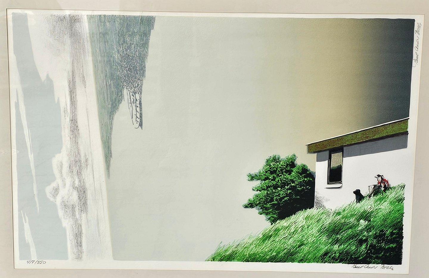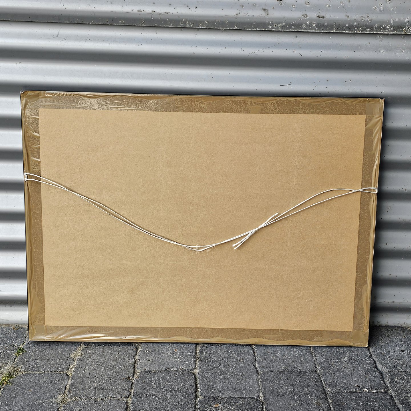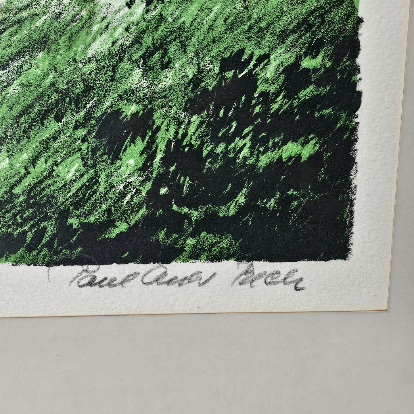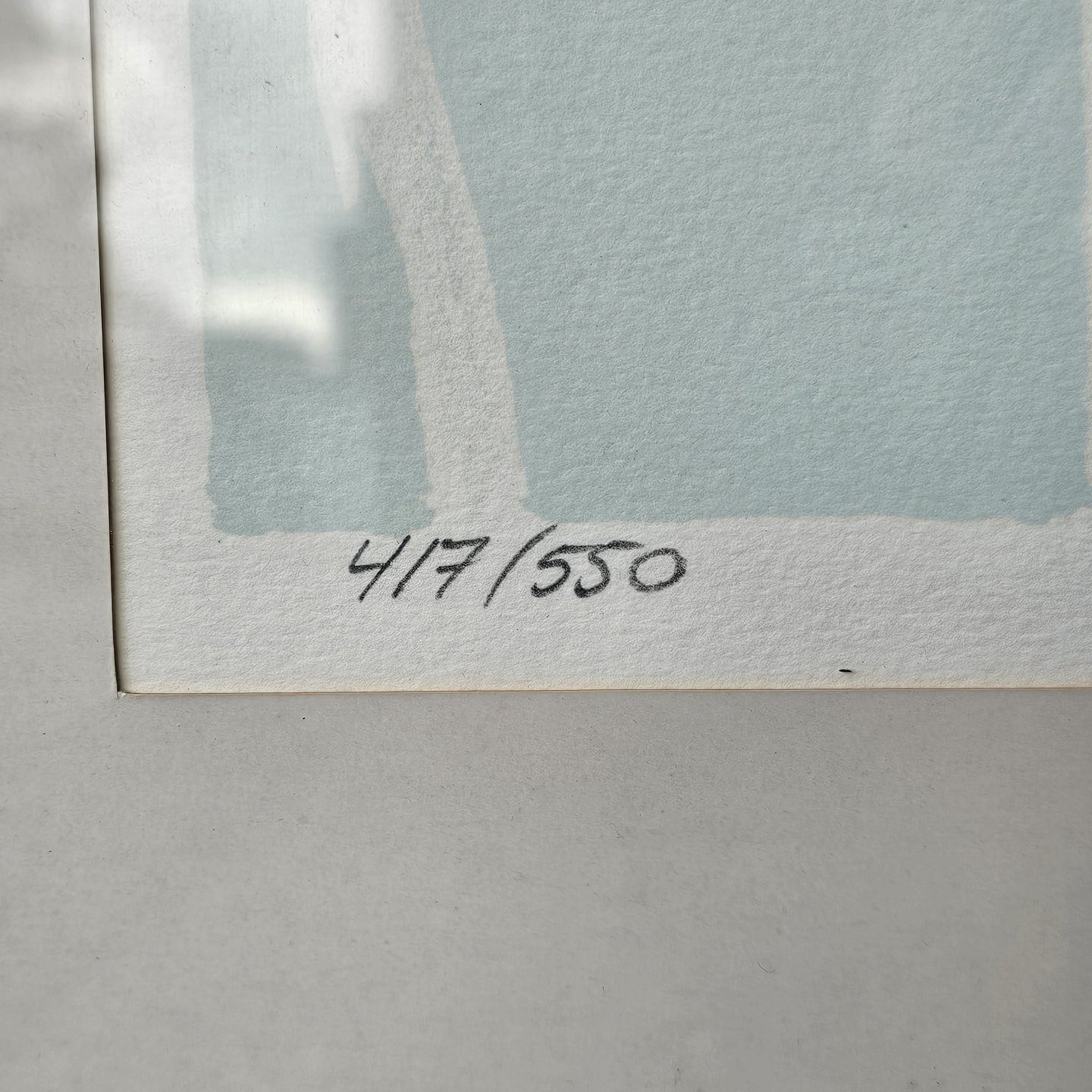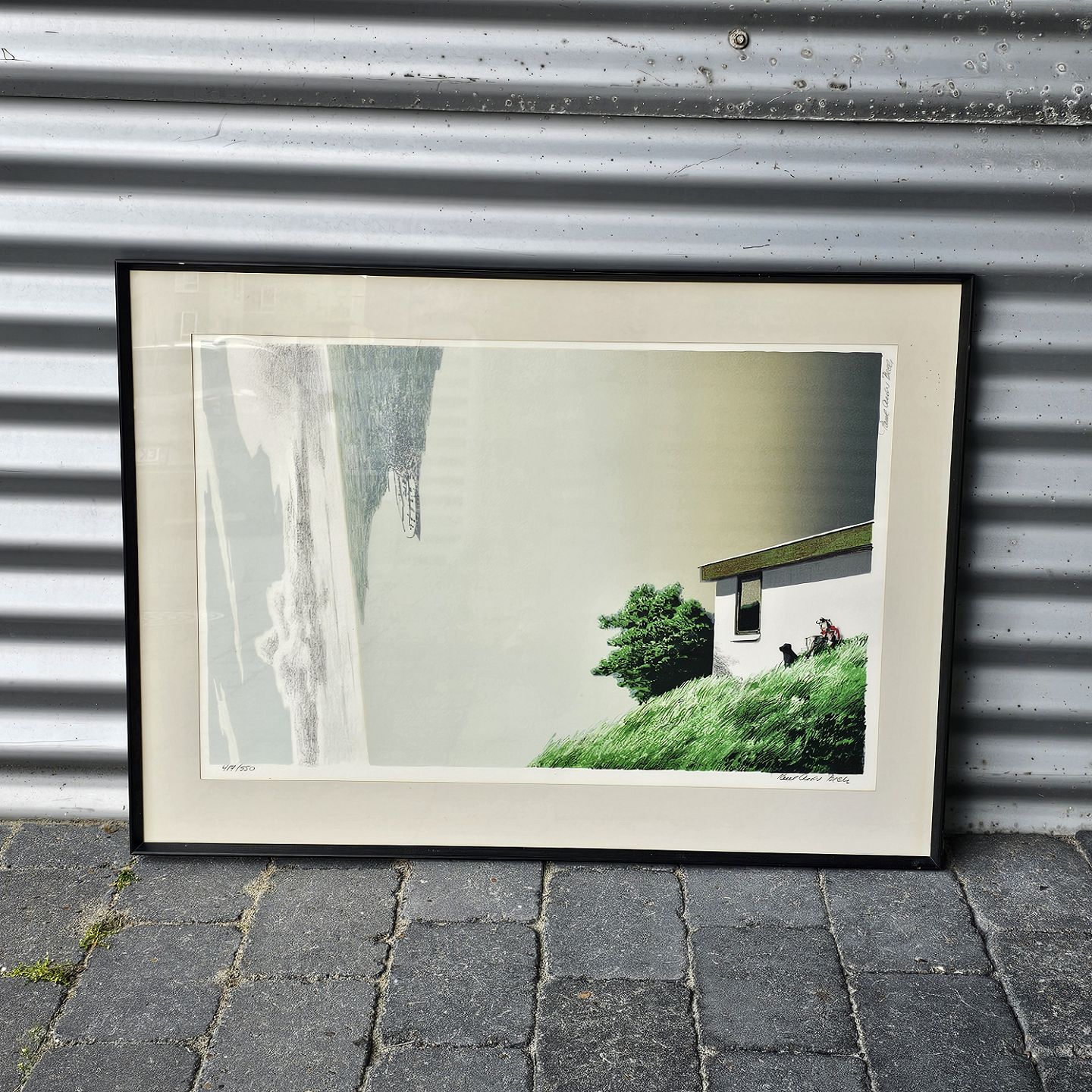 Litografi i sort ramme med abstrakt motiv som kan vendes både vandret og lodret. Lille fejl i papir