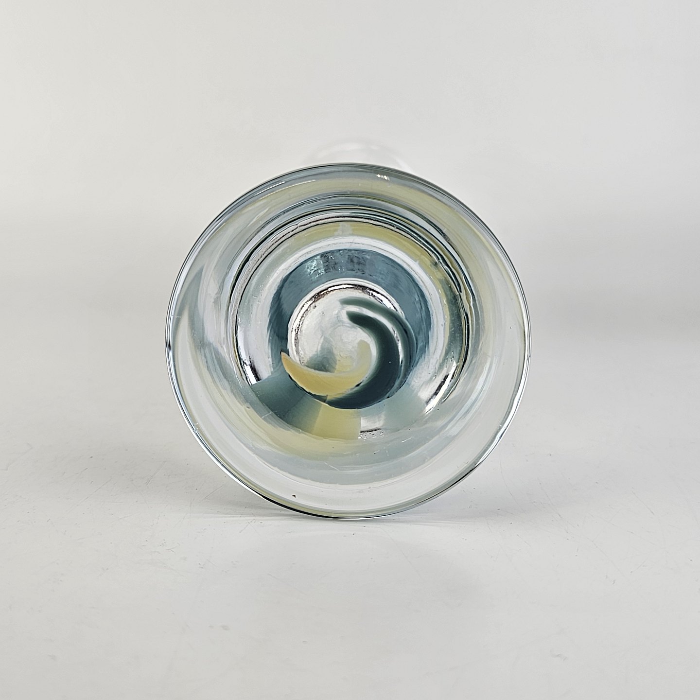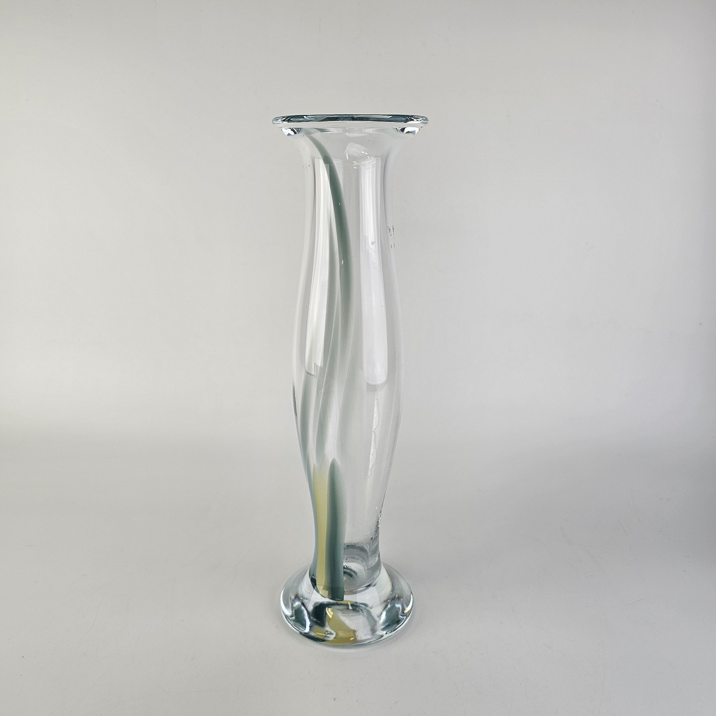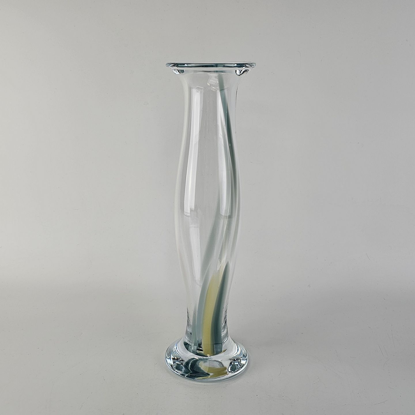 Høj, slank Harmonyvase i klart glas, med gul og blå farve dekoration