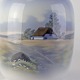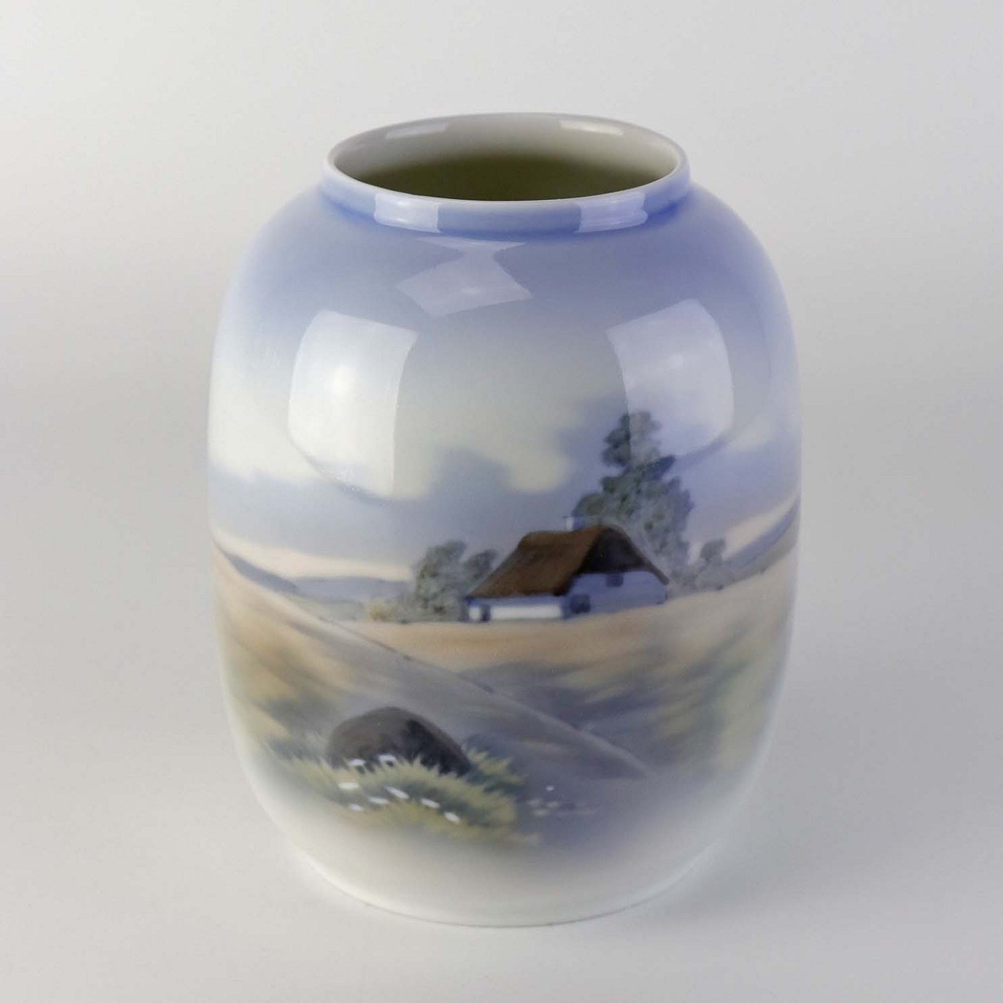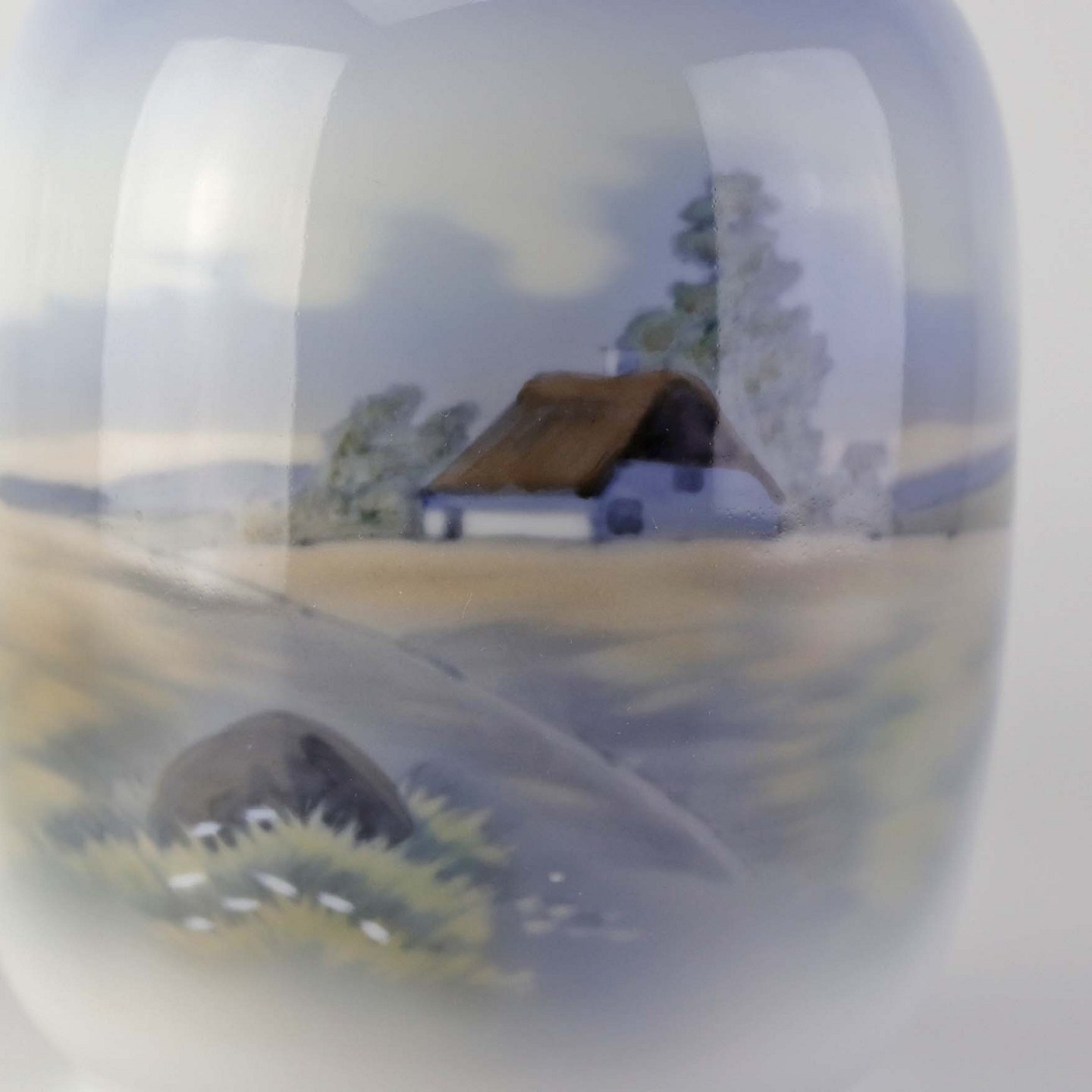 Vase i porcelæn med håndmalet motiv af stråtægt bondehus i landskab. Nr. 140-1/76