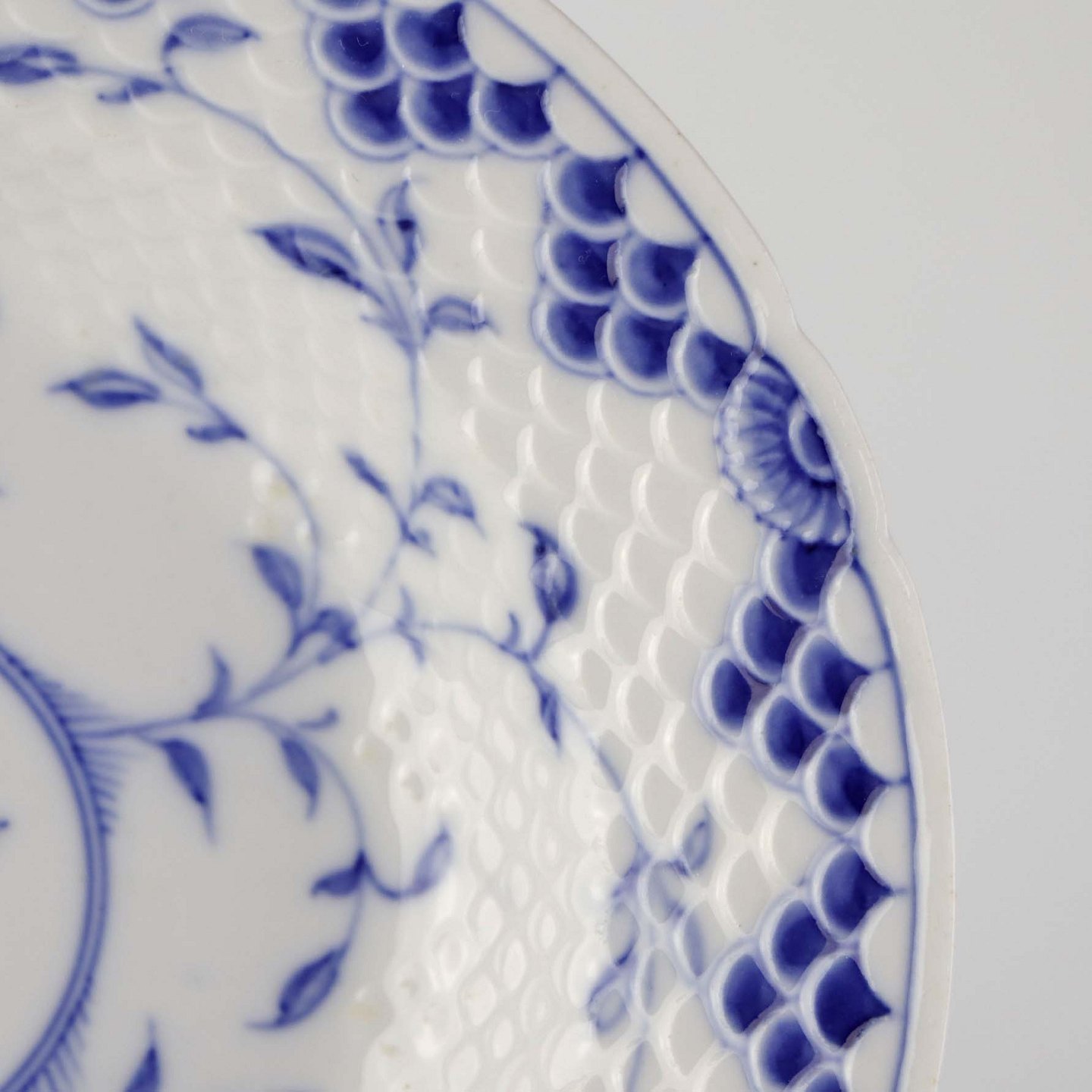 Tallerken i hvidt porcelæn med skelform dekoreret med blå motiver af ranker, blomster og sommerfugle.
