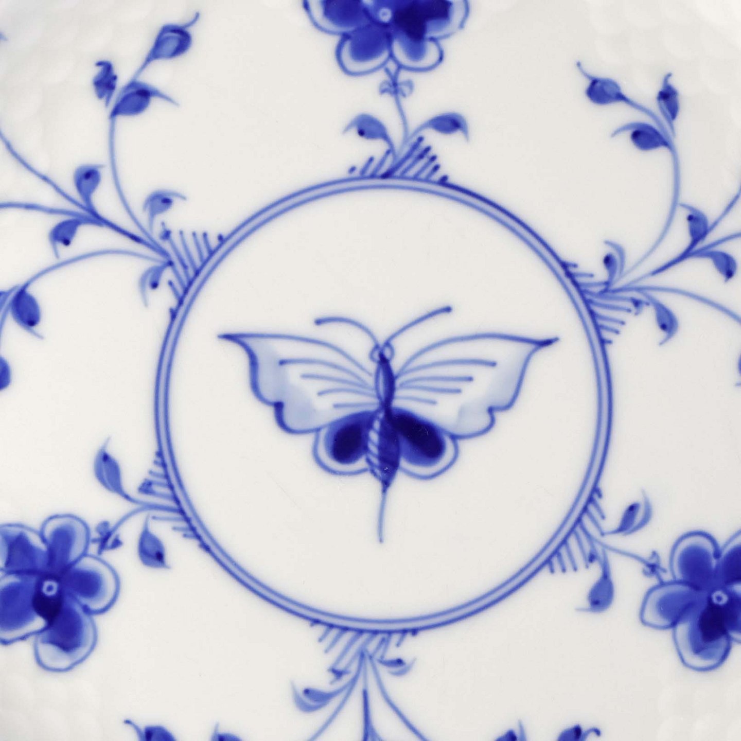 Tallerken i hvidt porcelæn med skelform dekoreret med blå motiver af ranker, blomster og sommerfugle.