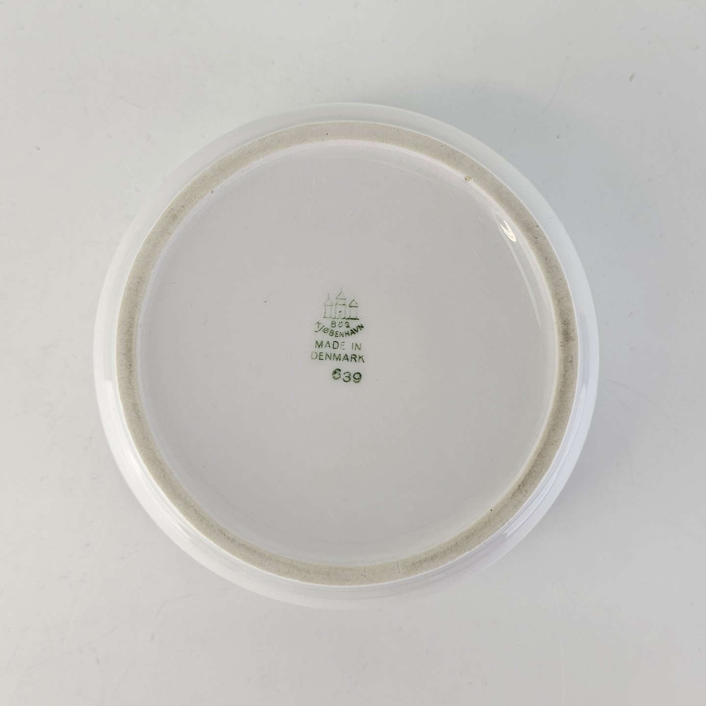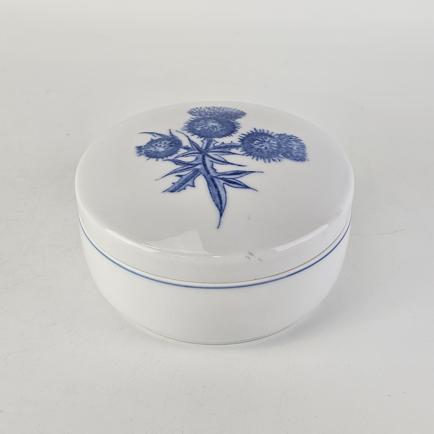 Bing & Grøndahl bonbonniere krukke med låg i hvidt porcelæn med motiv af tidsel i blå.