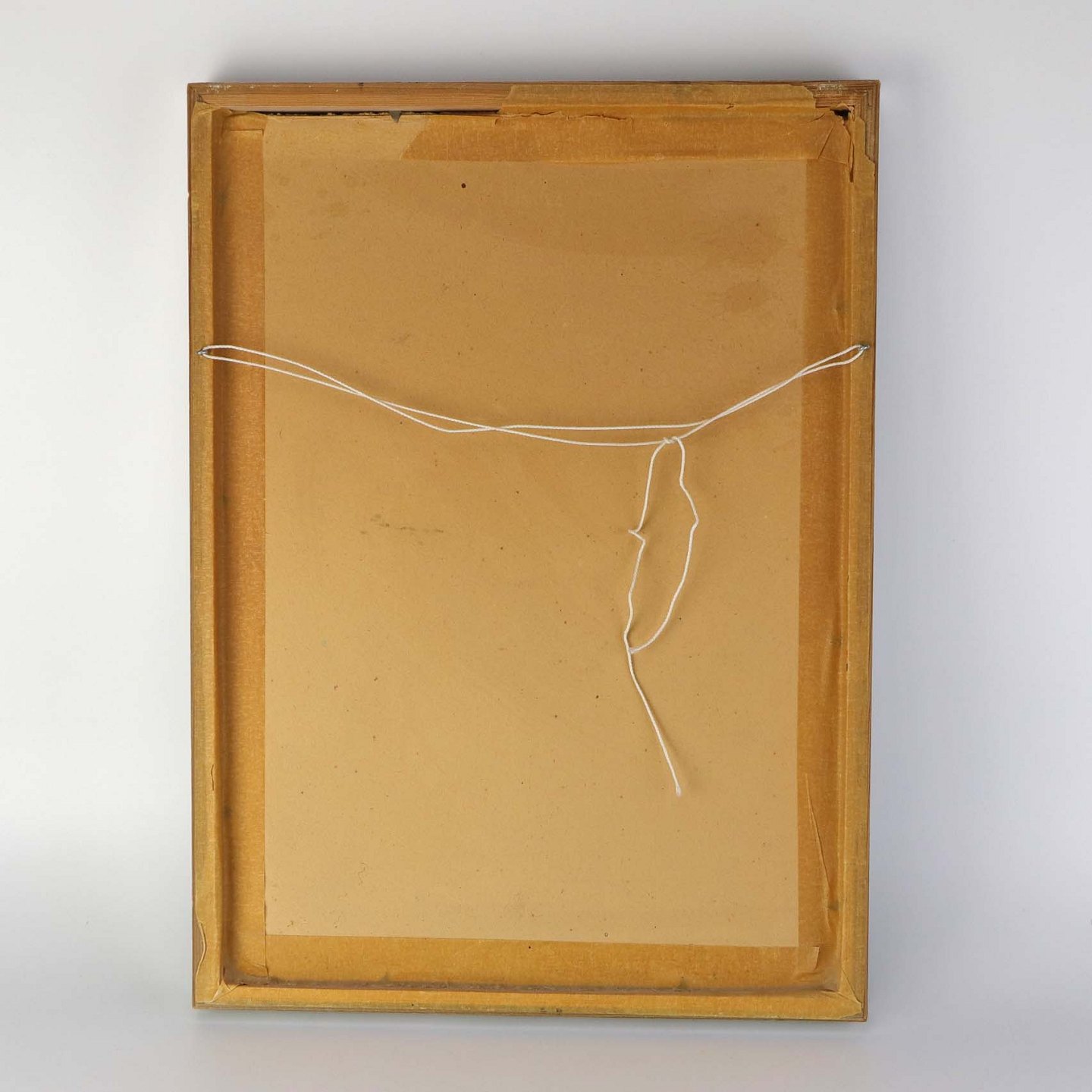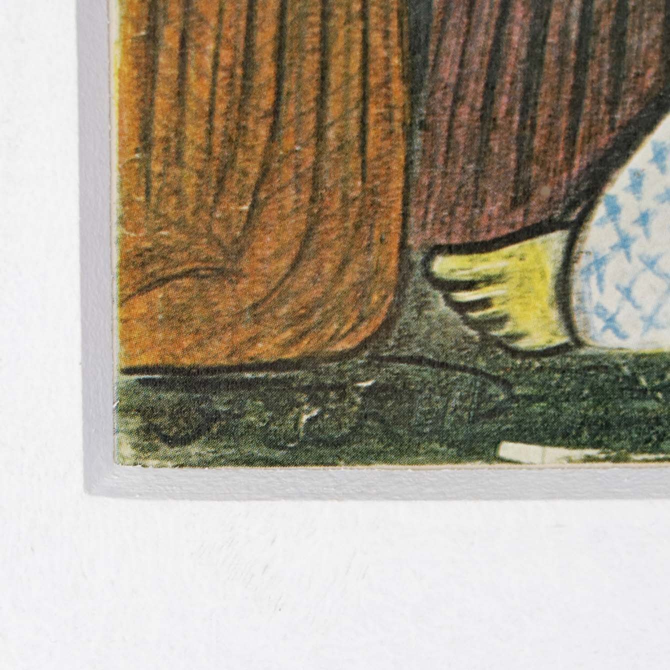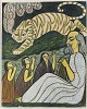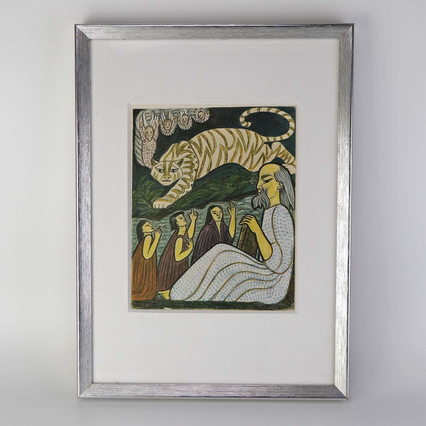 Indrammet tryk i passepartout med sølvmalet træramme og motiv af siddende ældre mand omgivet af børn, engle og en tiger.