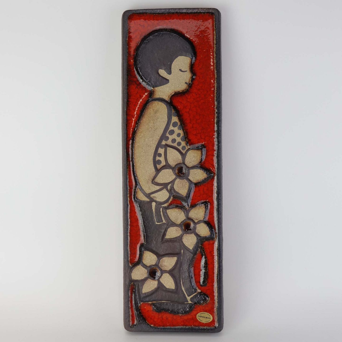 Relief i delvist glaseret stentøj med motiv af et barn med blomster. Nr. 5590
