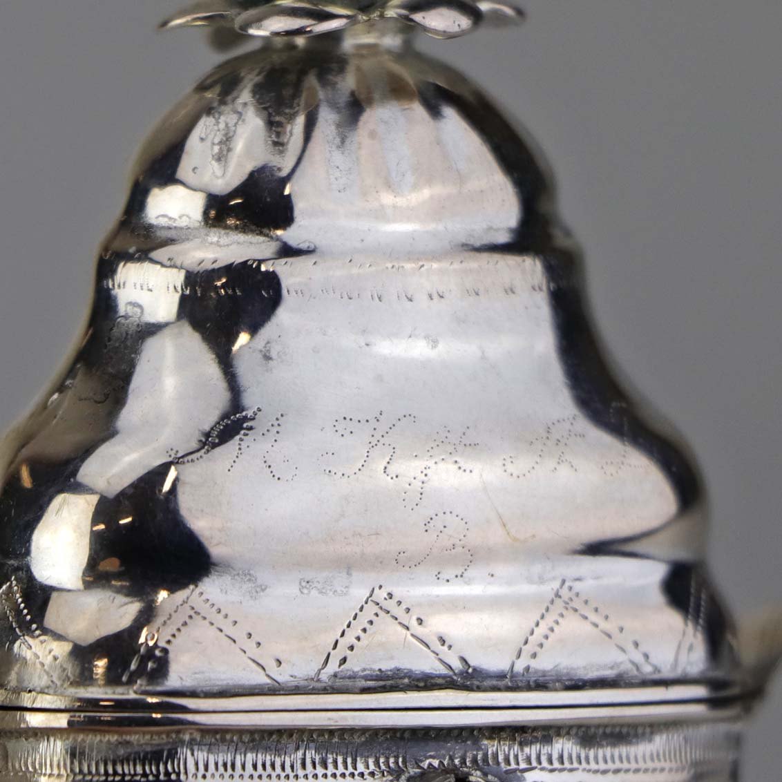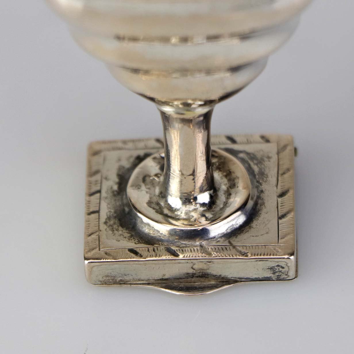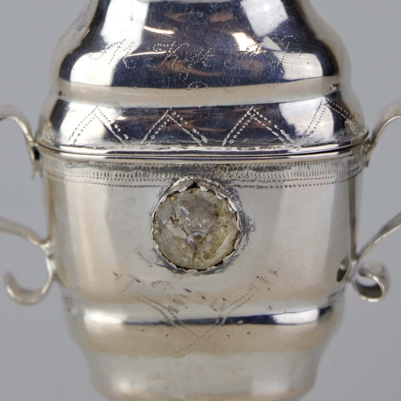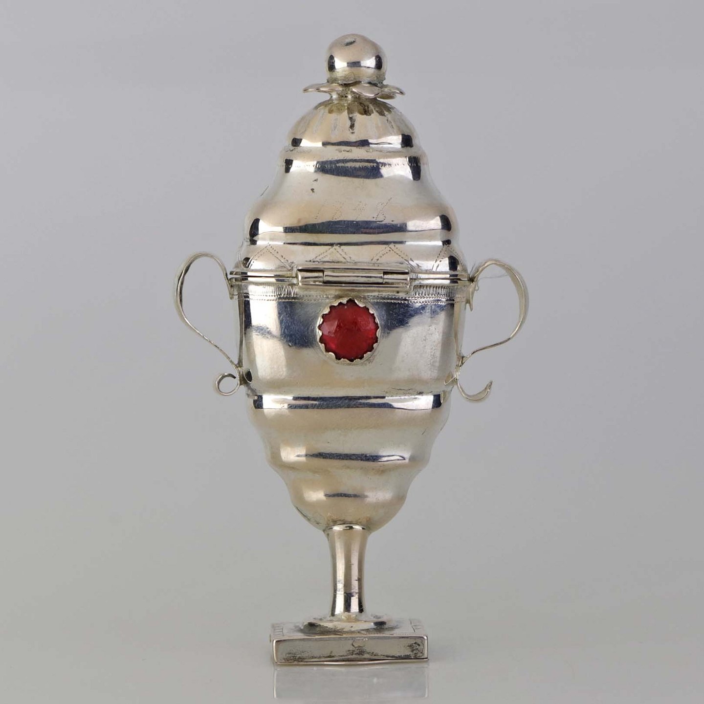 Hovedvandsæg i sølv med pynt af en hvid og en rød sten samt ekstra rum under foden. Fremstår med monogrammer og årstal 1819 samt år 1848