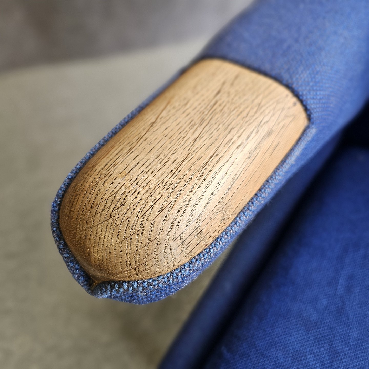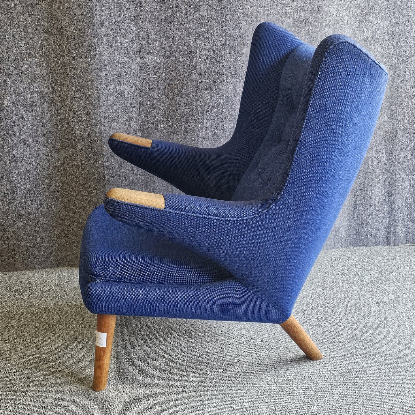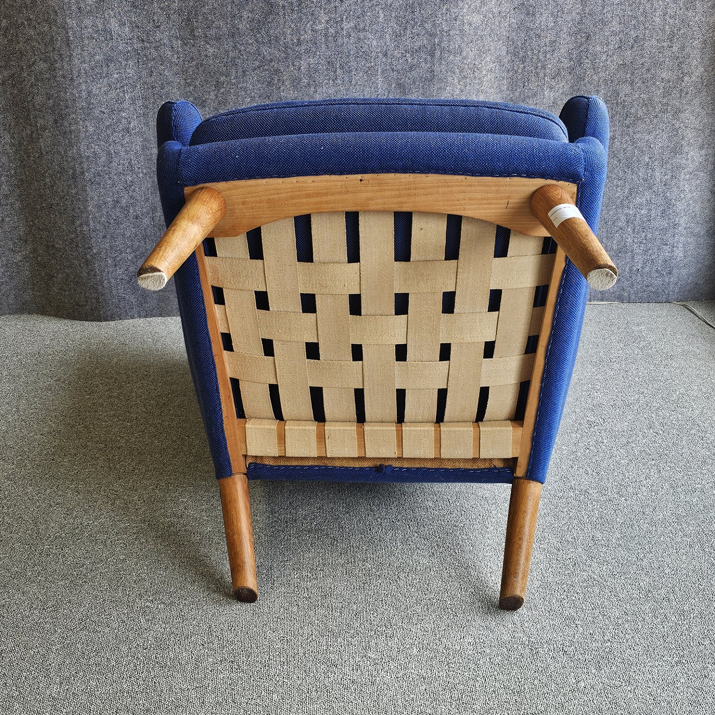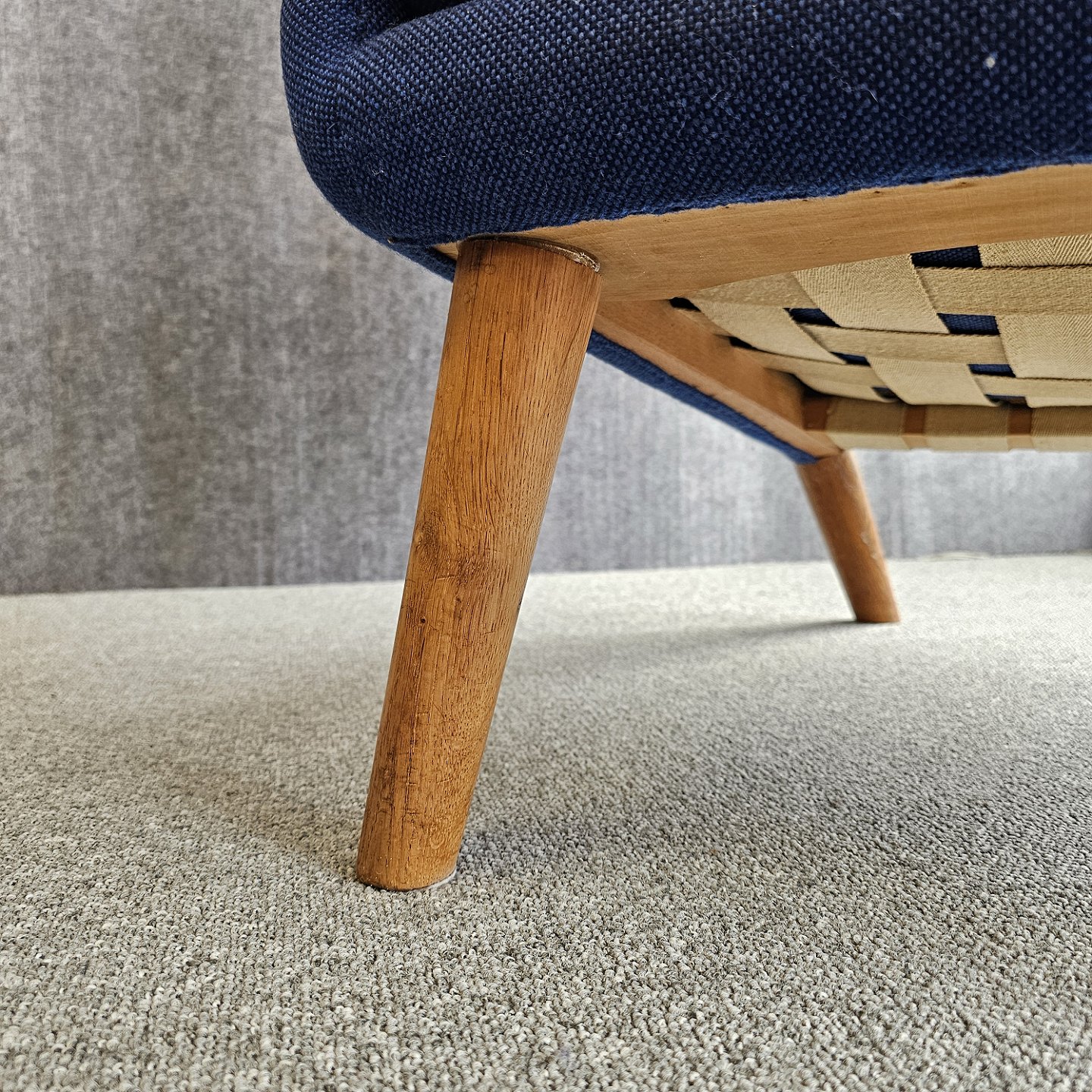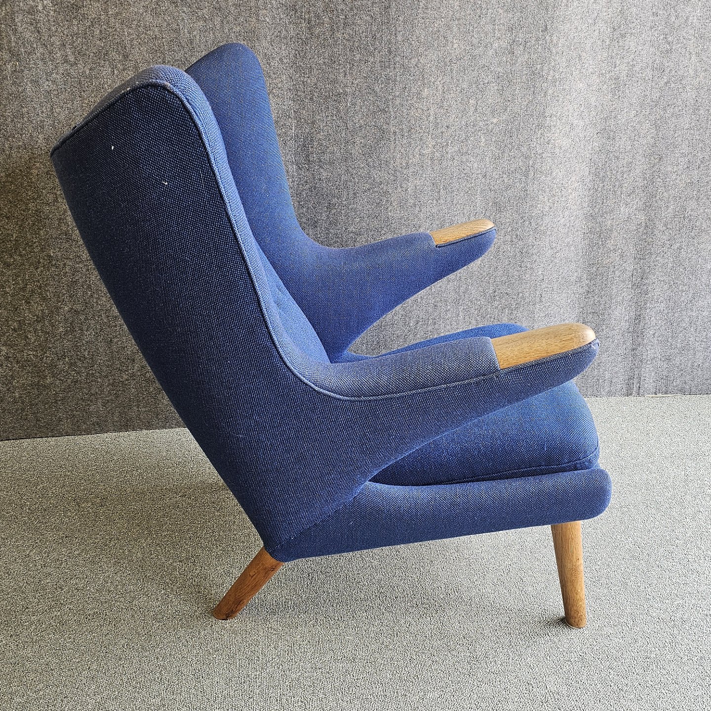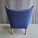 Bamsestol betrukket i blå Hallingdal uld med teak negle og ben i eg