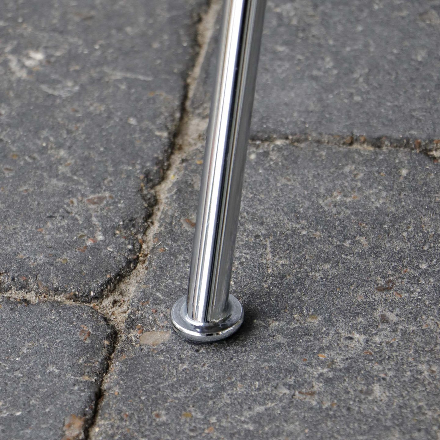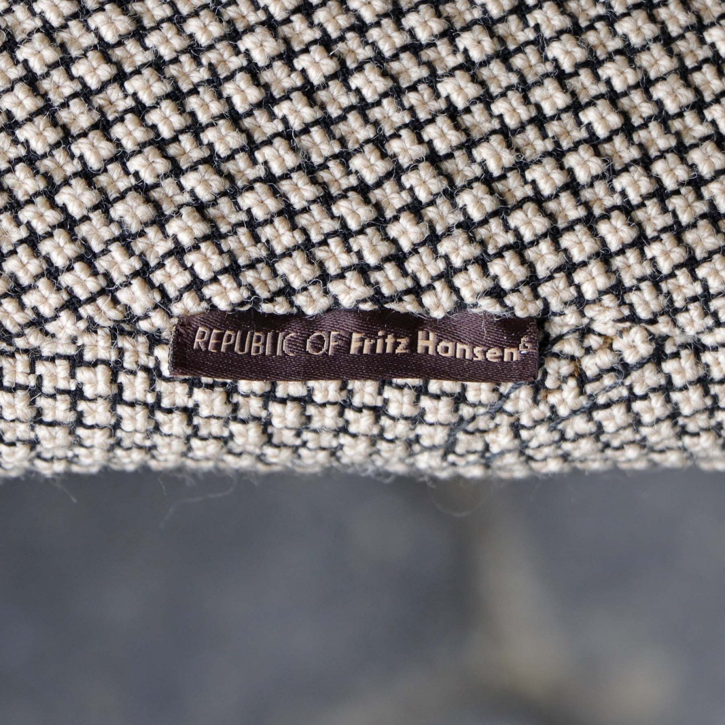 Spisebordsstol med ben i rustfrit stål og polstret sæde betrukket med struktureret stof i beige og sort. Model Dråben nr. 3110