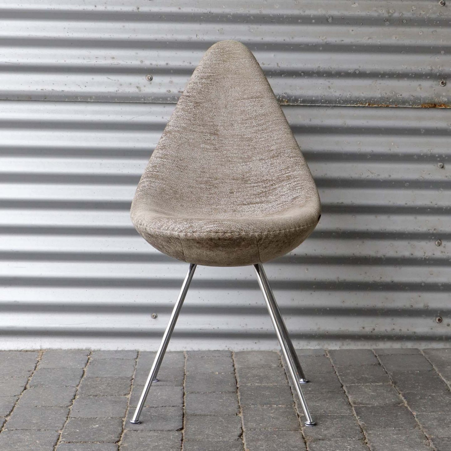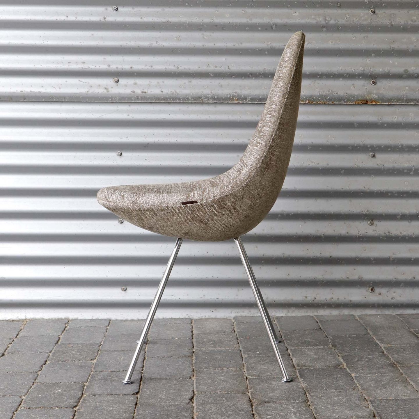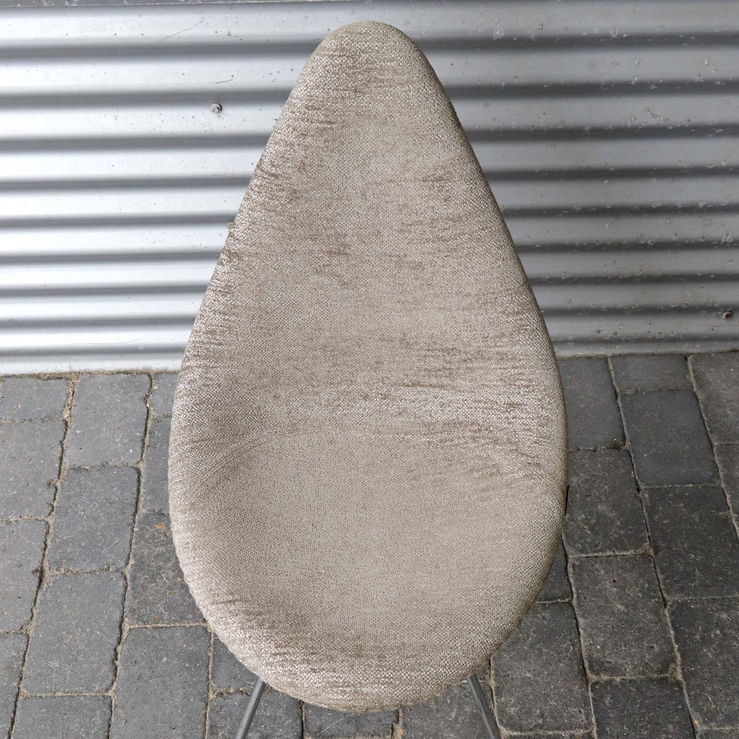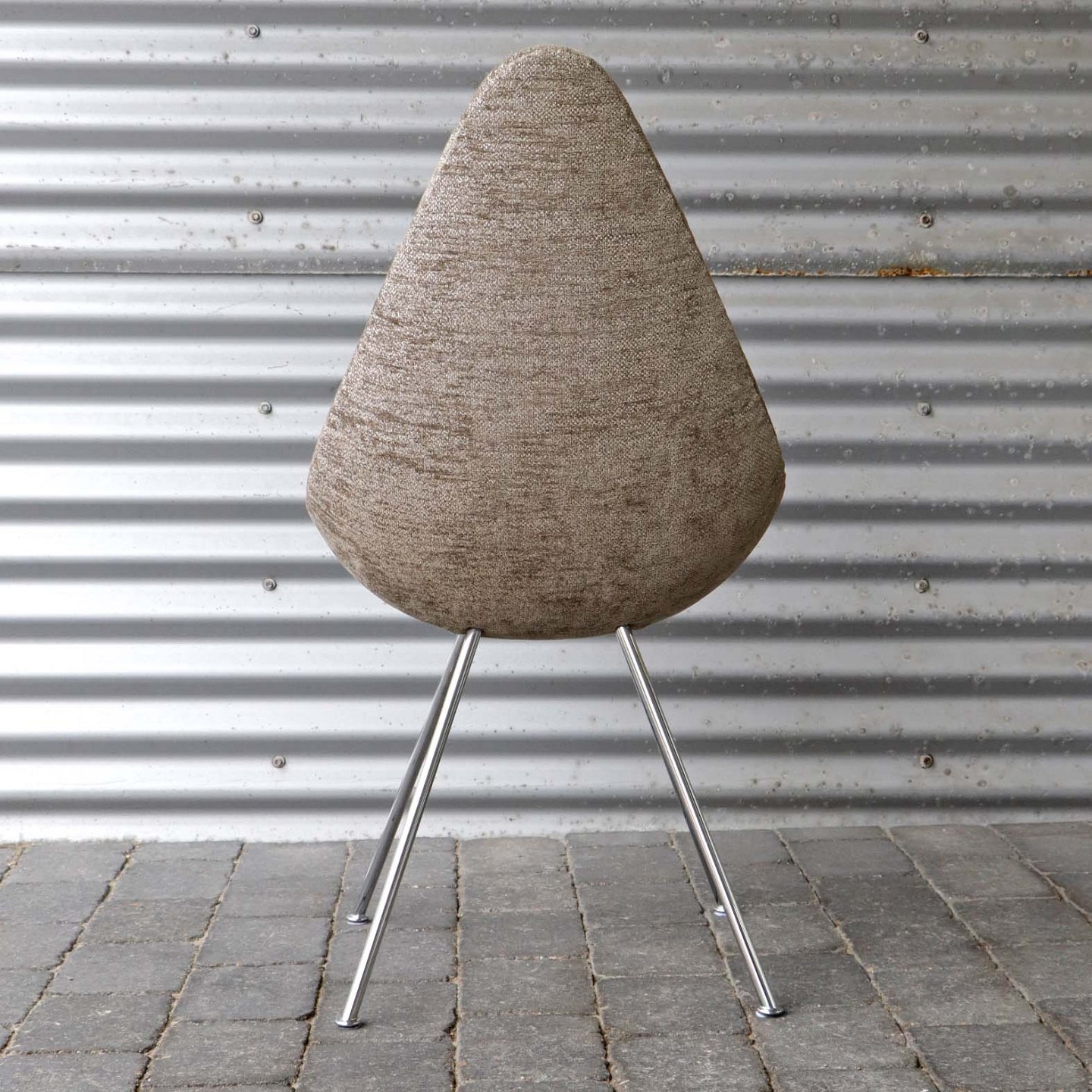 Spisebordsstol med ben i rustfrit stål og polstret sæde betrukket med brun og hvid meleret stof. Model Dråben nr. 3110