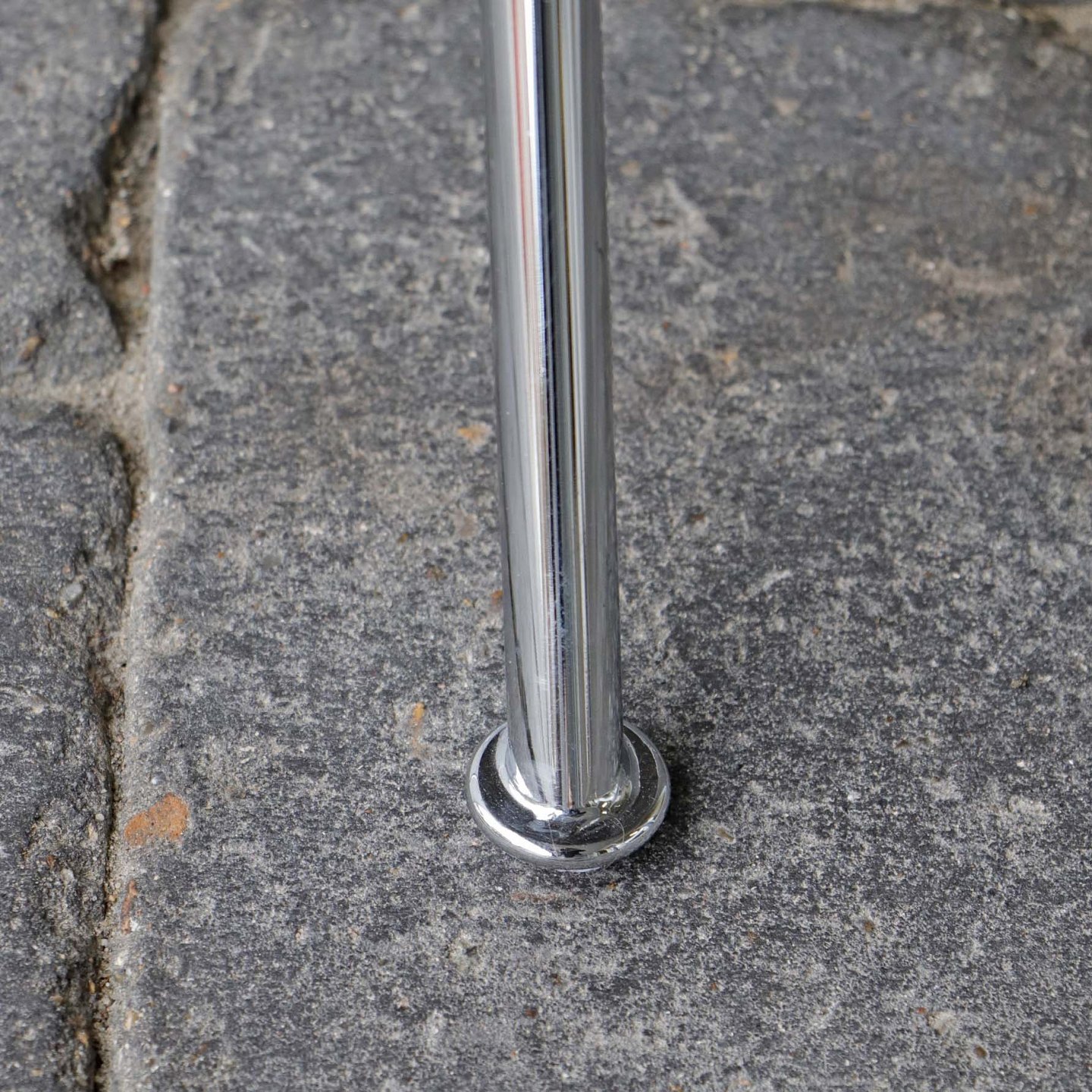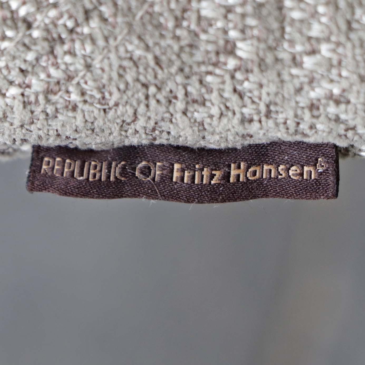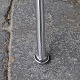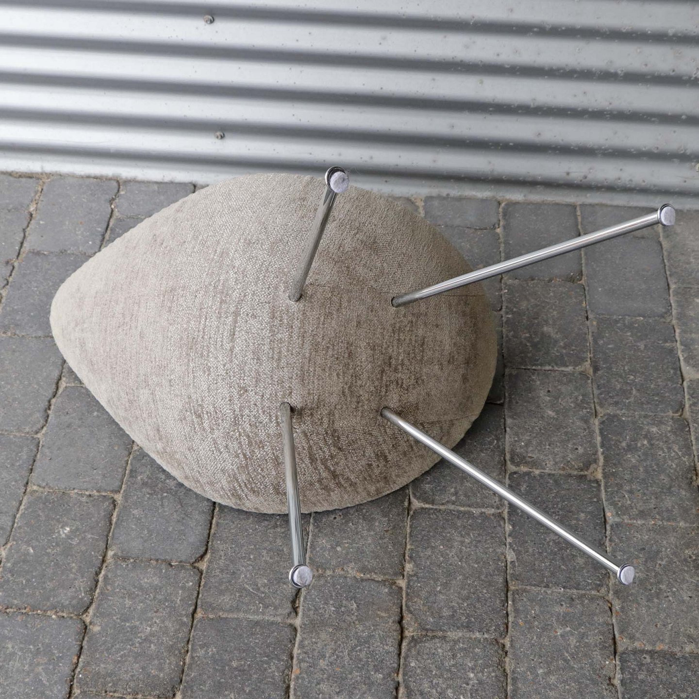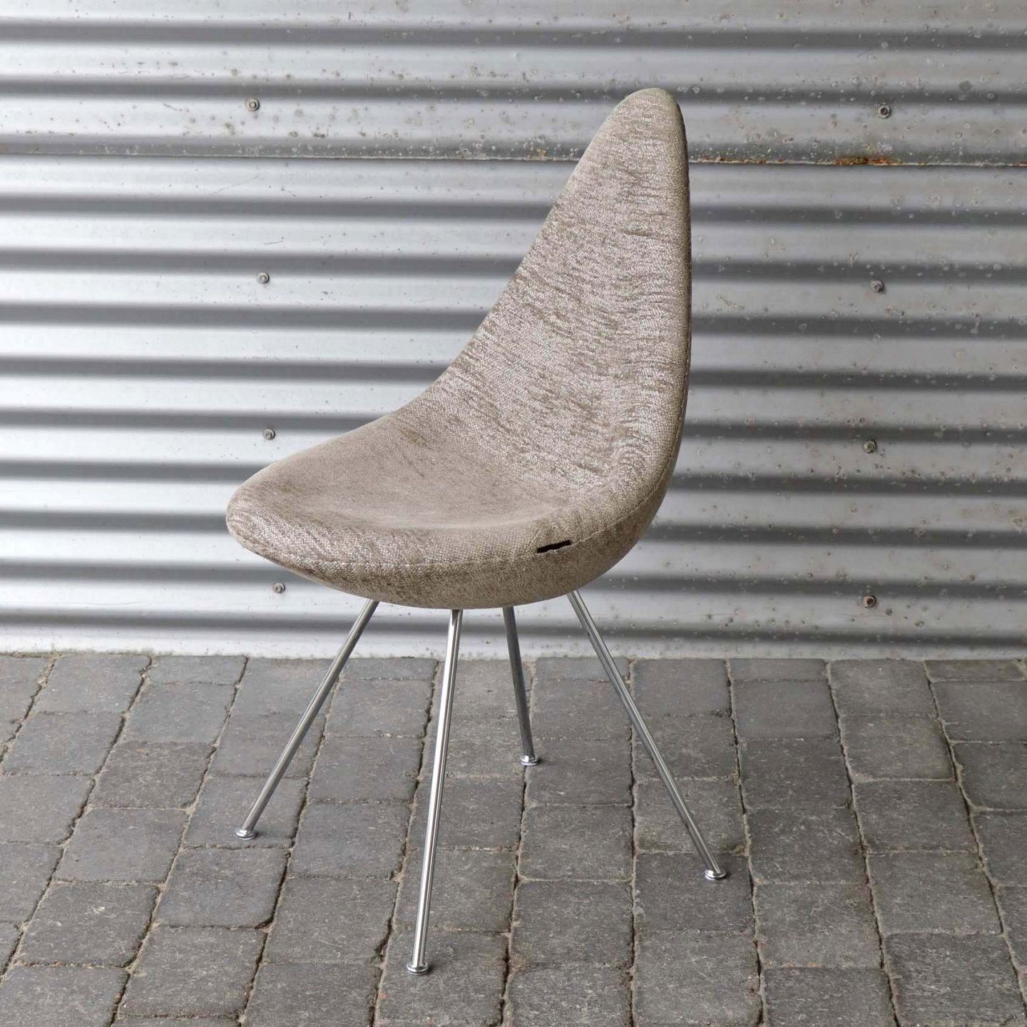Spisebordsstol med ben i rustfrit stål og polstret sæde betrukket med brun og hvid meleret stof. Model Dråben nr. 3110