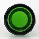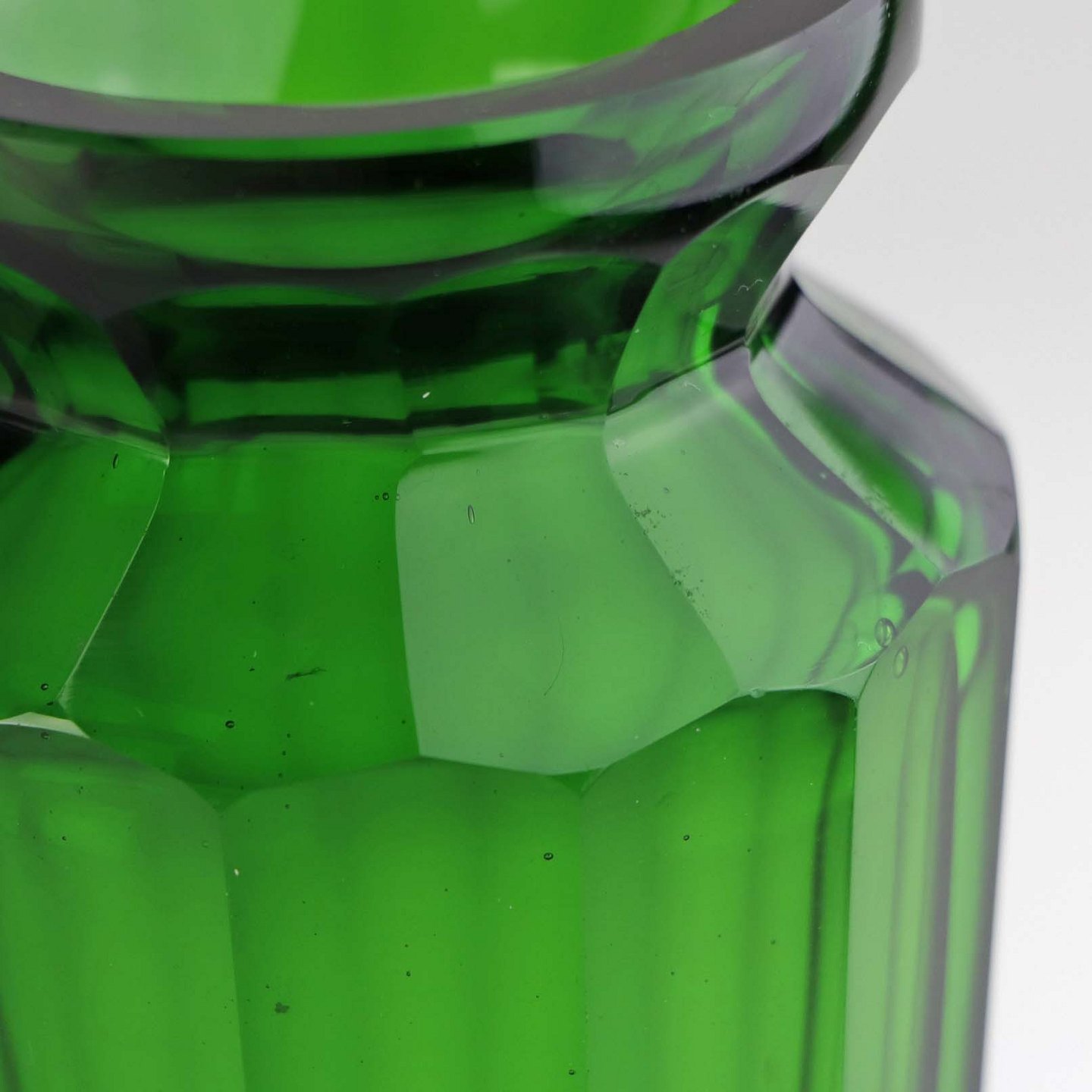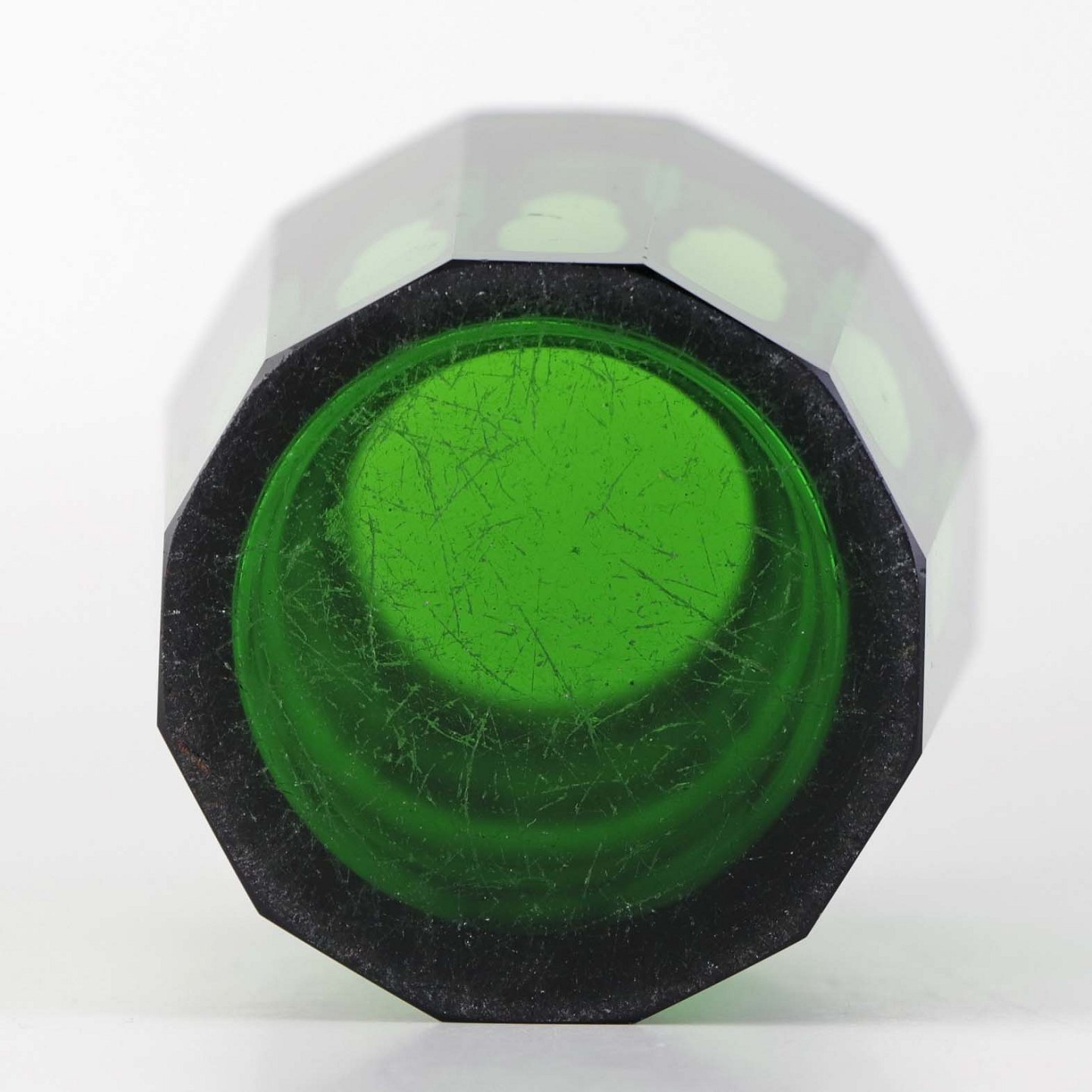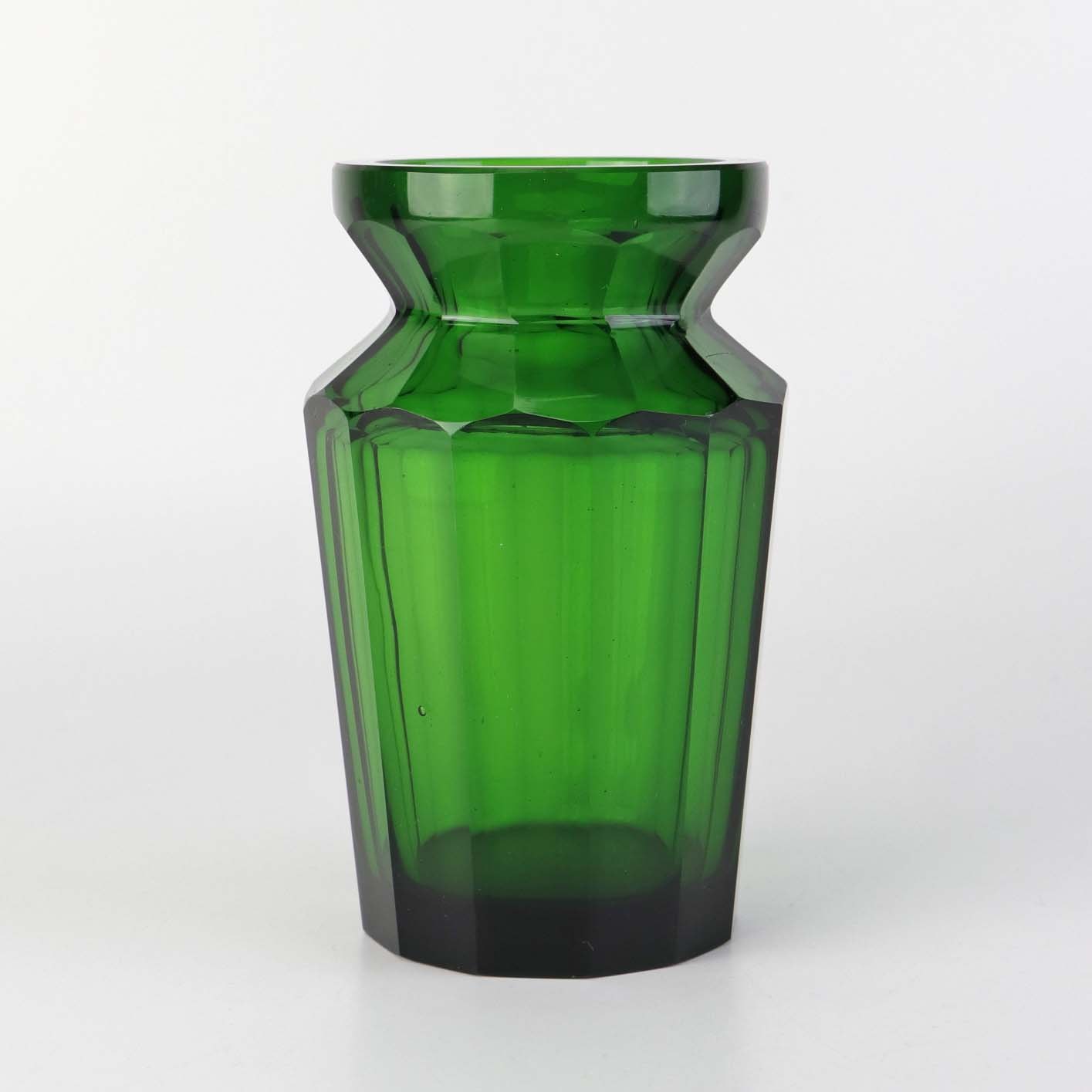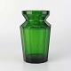 Lille vase i mundblæst grønt glas med facetslebet kantede sider og rund topkant.