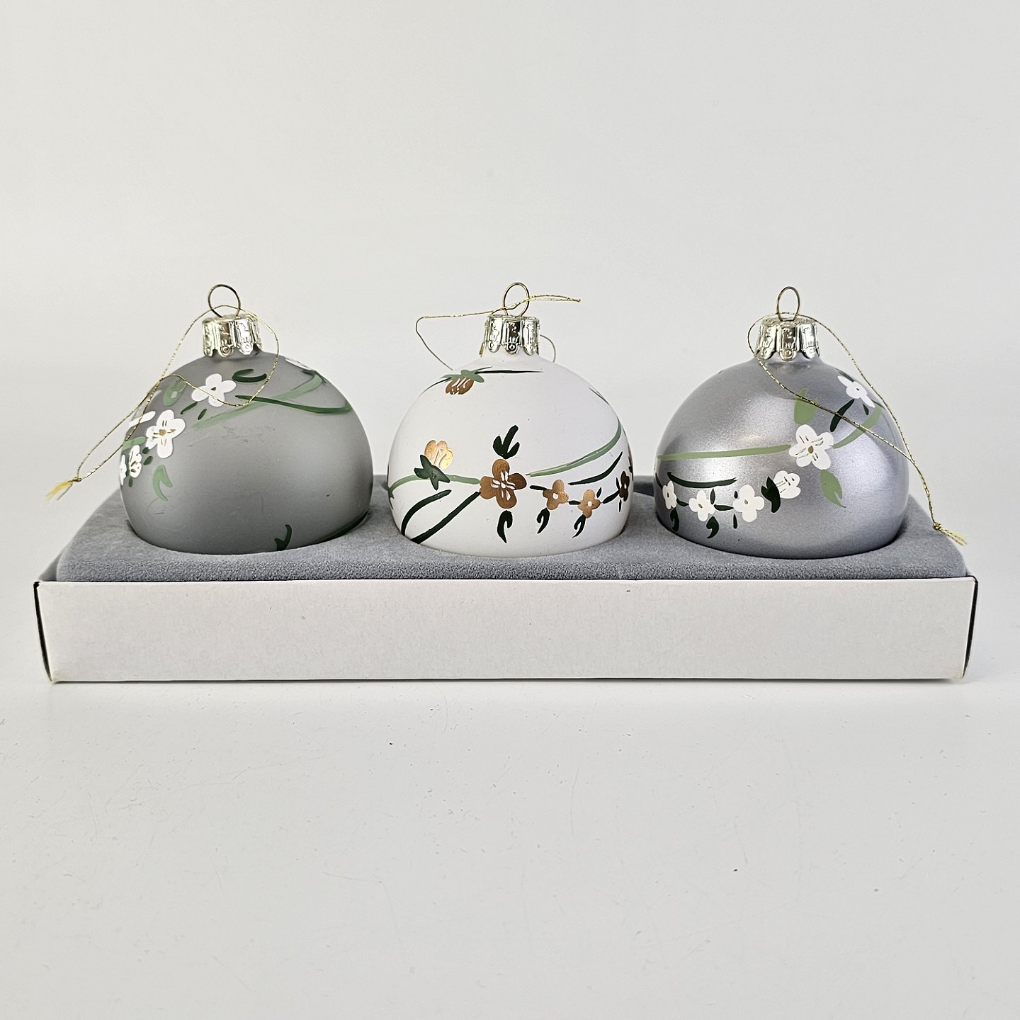 3 stk malede julekugler i glas med blomstermotiv