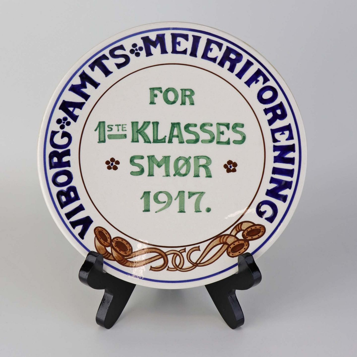 Ældre platte i fajance med teksten Viborg Amt Mejeriforening for 1ste klasses smør 1917 og motiv af fire blæseinstrumenter kaldet lur.