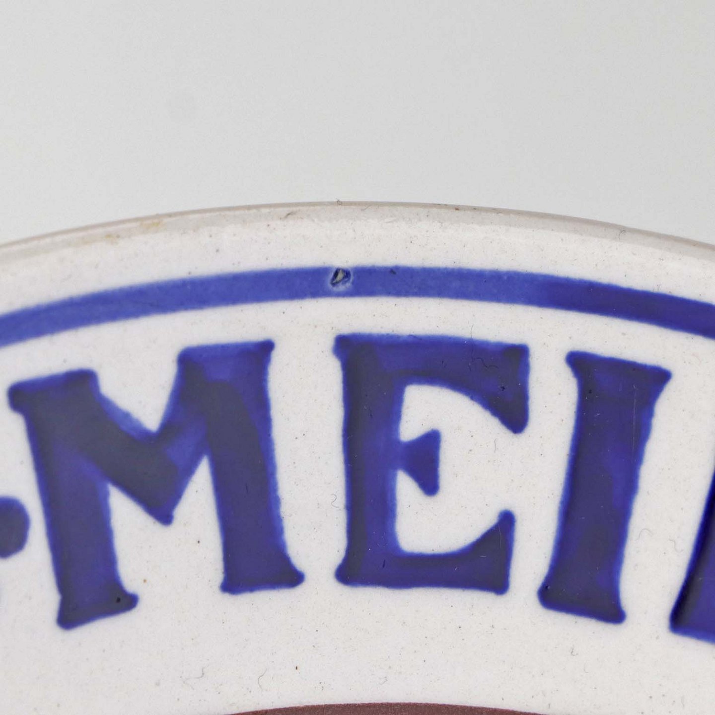 Fremstår med område på bagsiden med lettere brunet kant samt ujævnhed i fajancen på frontsidens top.