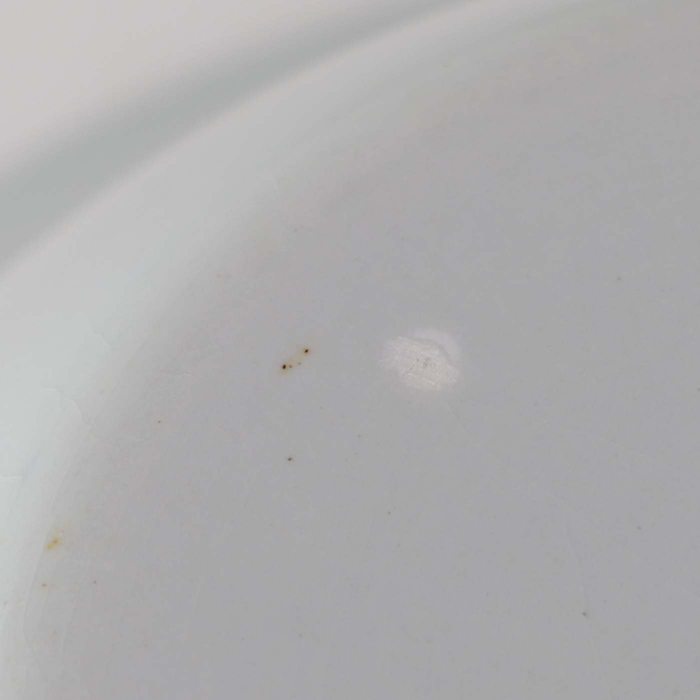 Glat hvid fajance med blå dekoration af blomster og blå bort.