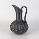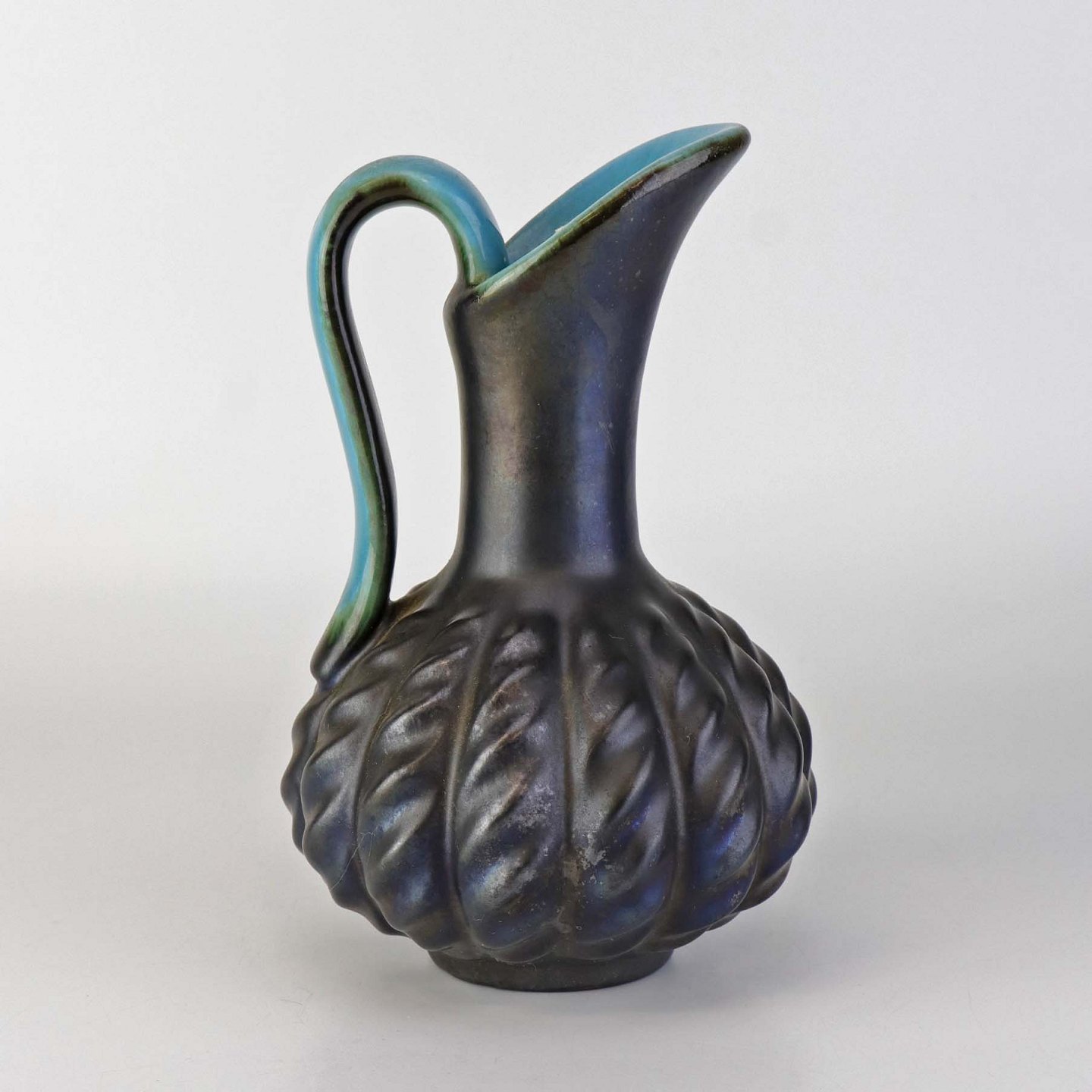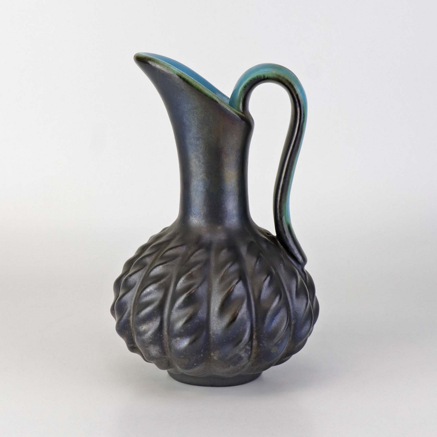 Kande i keramik med indvendig turkis glasering og udvendig mørk og delvist metallisk glasering.