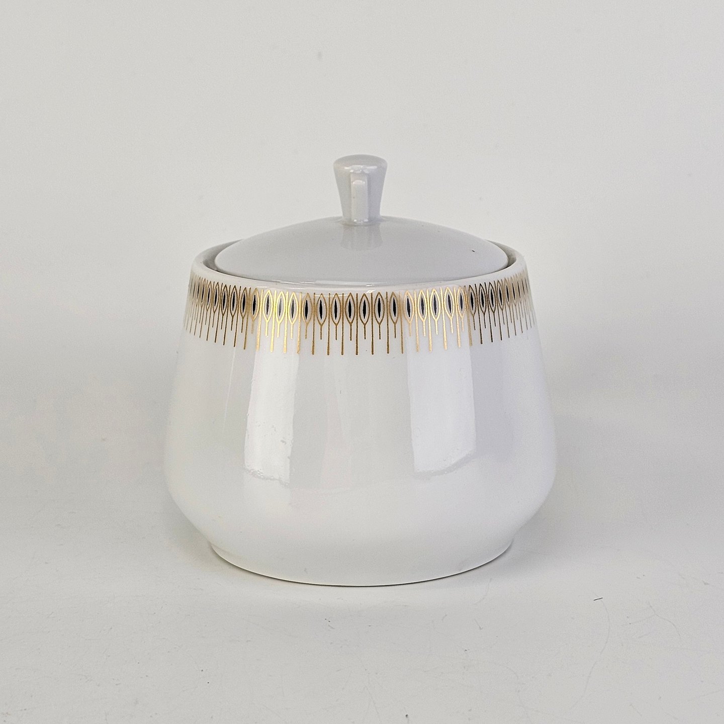 Sukkerskål med låg i hvidt porcelæn med dekoration i guld fra stellet Trend 1220
