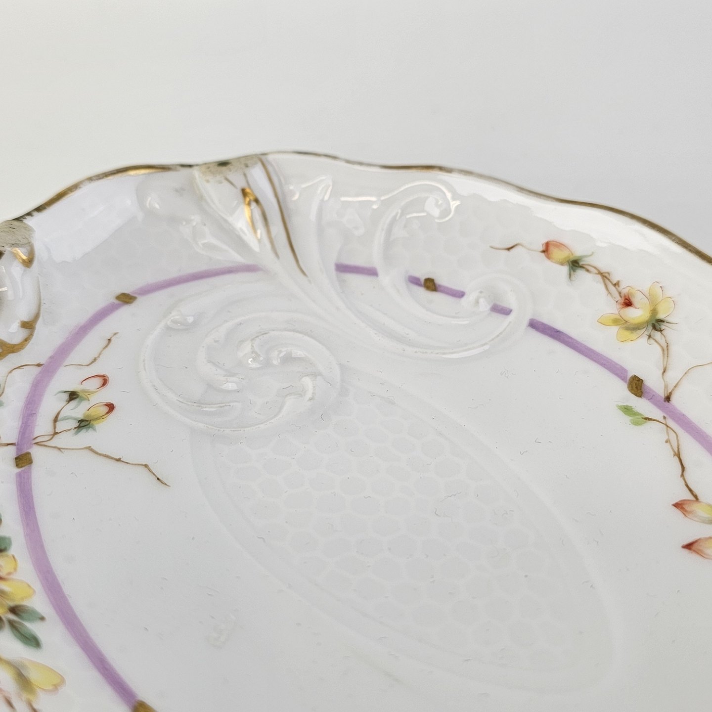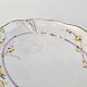 Service i hvidt porcelæn med hamret kantmønster dekoreret med gule blomsterranker og lyslilla streg. Stellet er med guldkant og det er mærket med bølger anvendt frem til 1890.