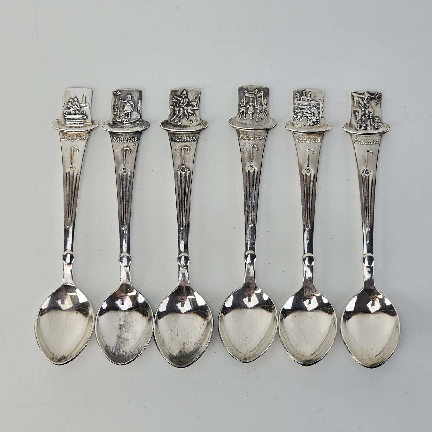 En lille bog med seks pletsølvskeer, alle med forskellige motiver fra H. C. Andersens eventyr
