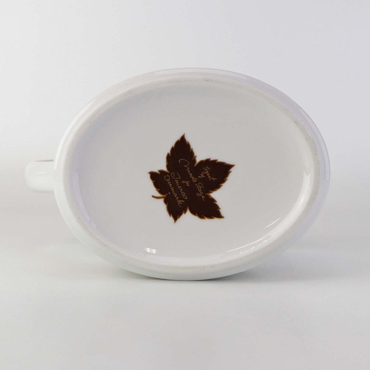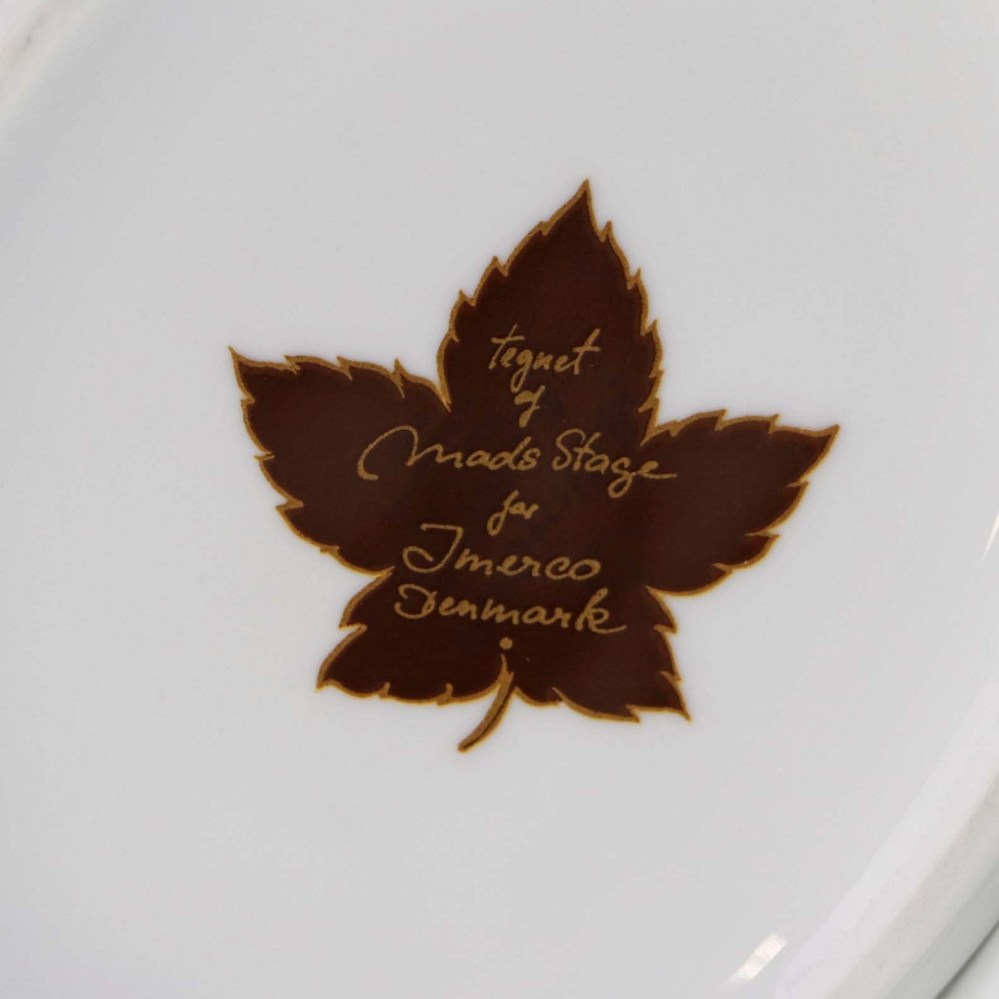 Jagtstellet er i glat hvidt porcelæn med gyldenbrun kantdekoration og motiver af forskellige vilde danske dyr i deres naturlige miljø. Stellet er holdt i dæmpede varme efterårsfarver.