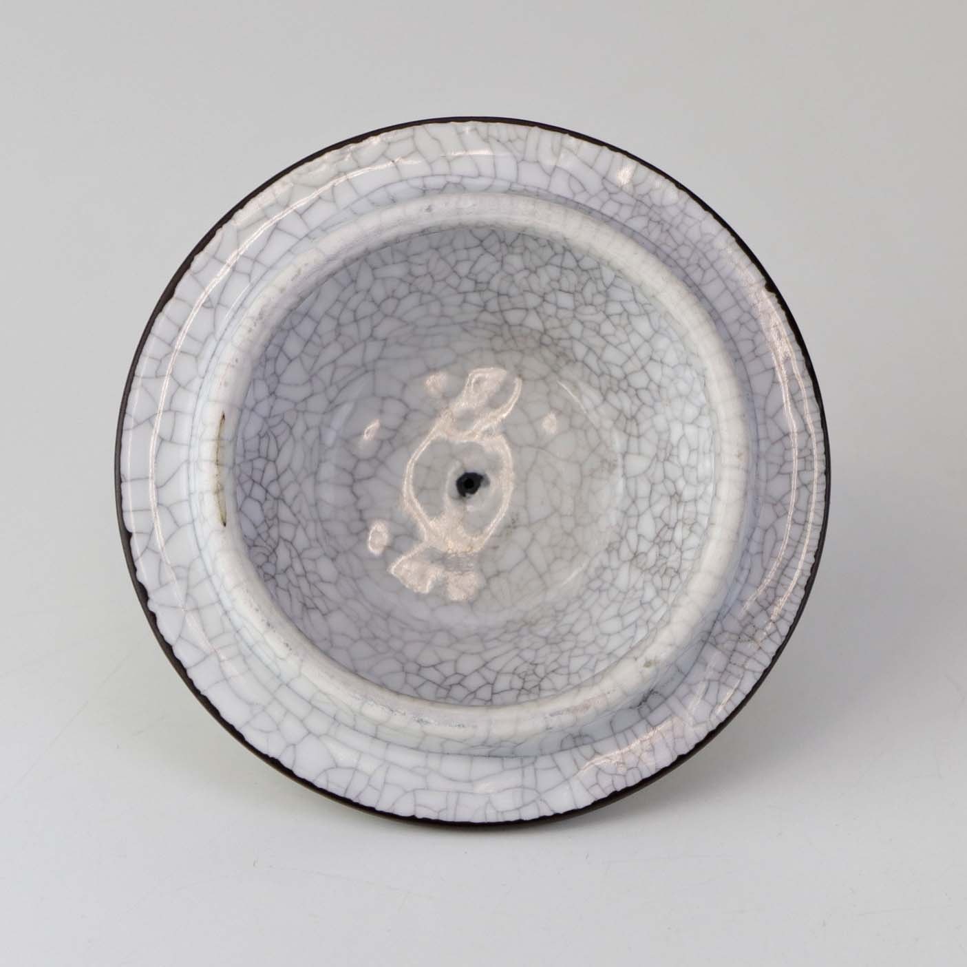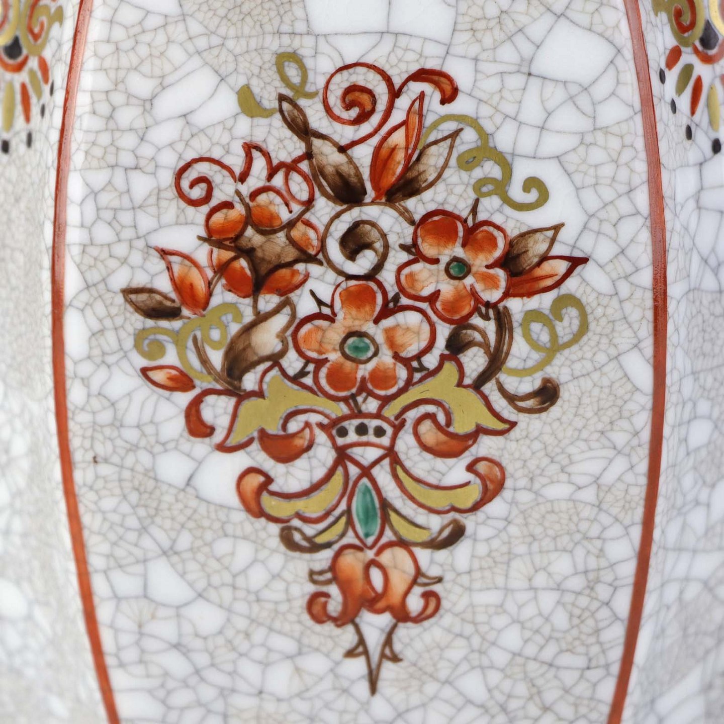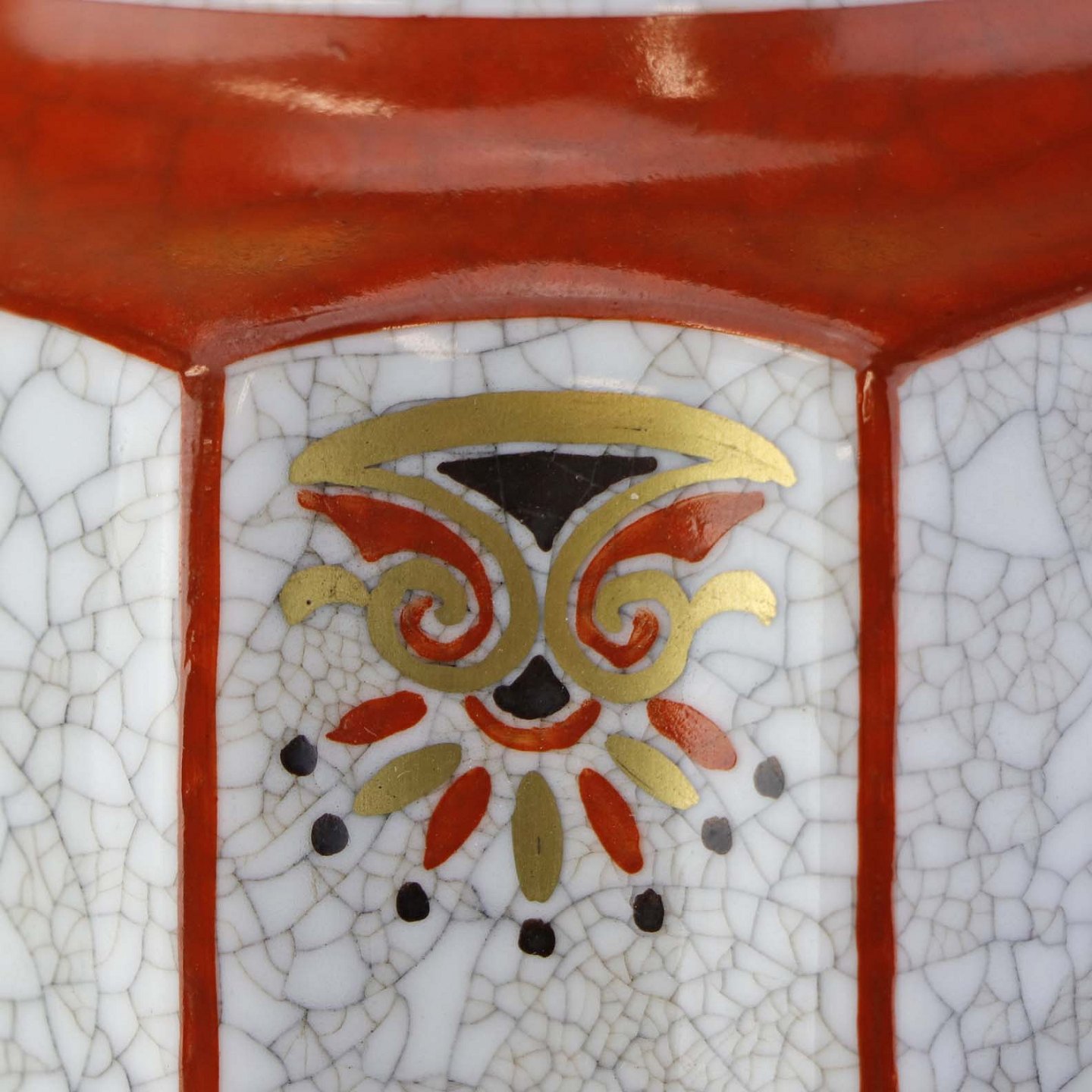 Kantet krukke med låg i porcelæn med krakele glasur og motiv af blomster samt kantet med orangerød bort og guld kant. Nr. 196/600