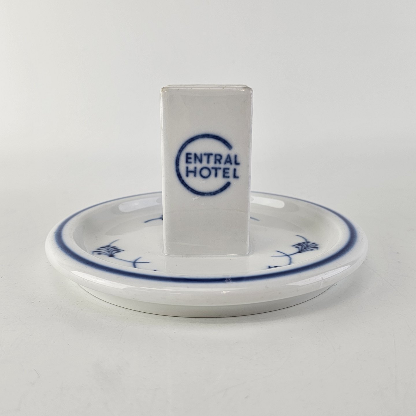 Tandstikkeholder i hotelporcelæn med motiv fra restaurant Kilden i Aalborg fra stellet Blåmalet