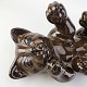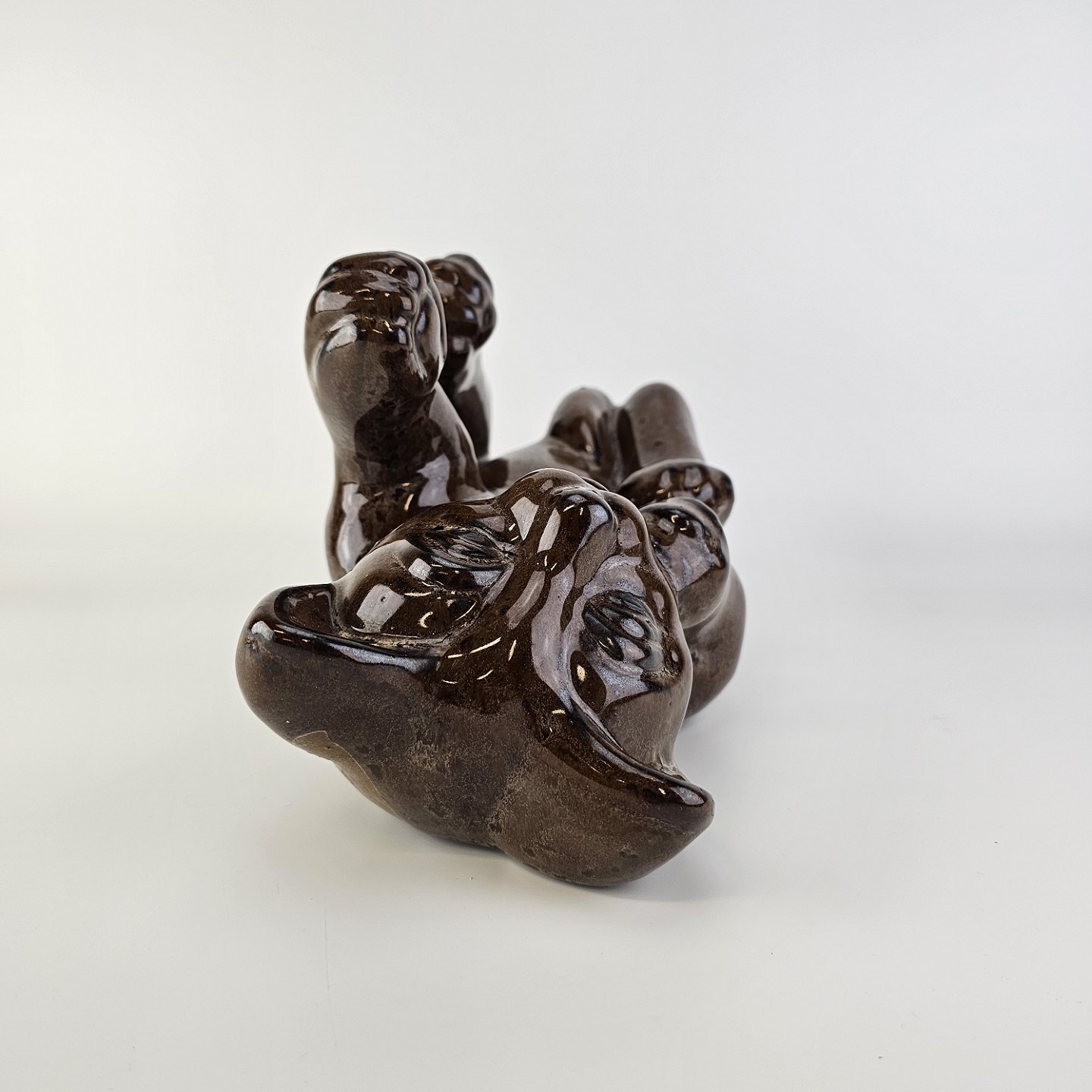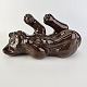 Figur i brunt glaseret lertøj med motiv af en kat som ligger på ryggen
