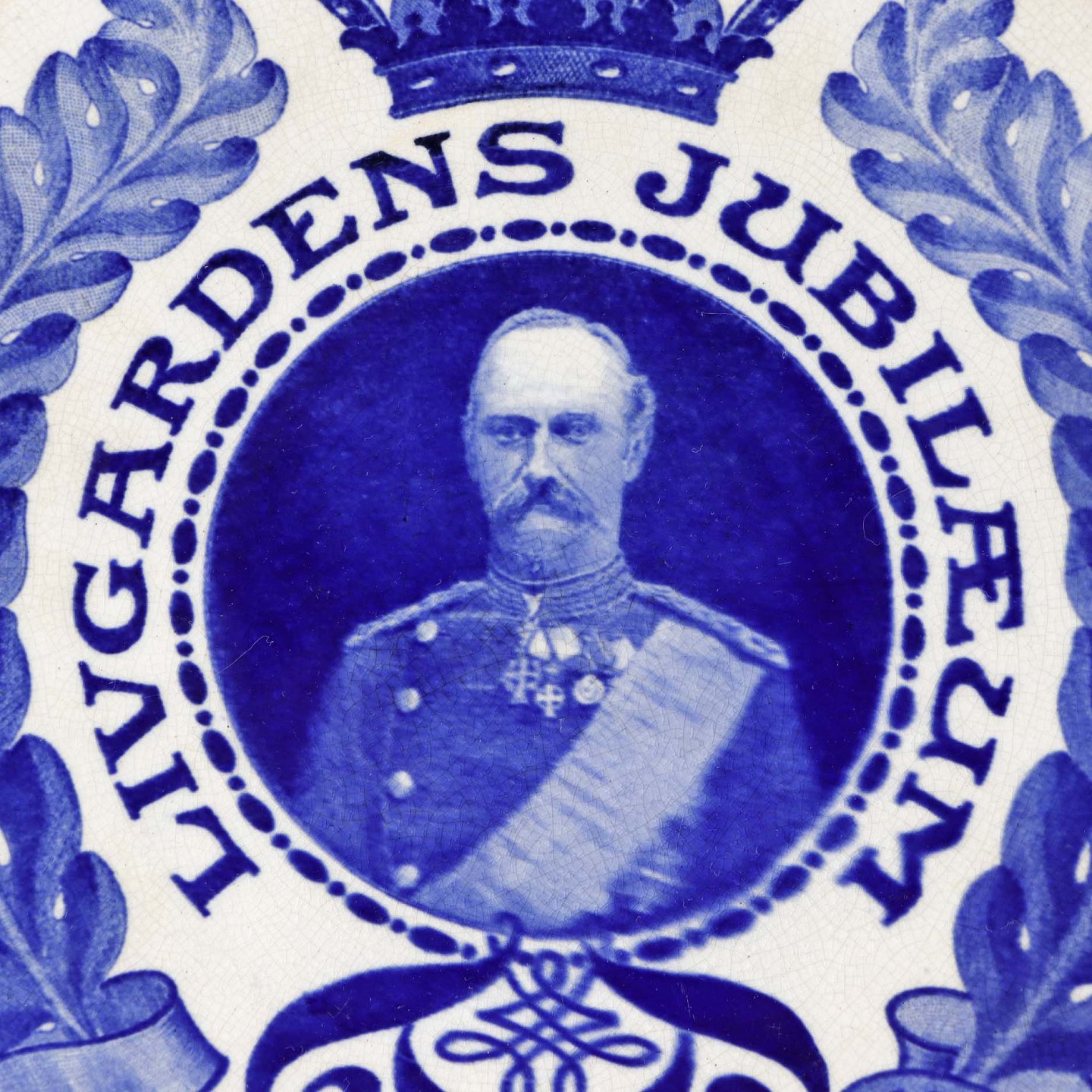 Platte i fajance, som blev udgivet i forbindelse med Livgardens 250 års jubilæum med teksten Livgardens jubilæum år 1658-1908 og motiv af Kong Frederik VIII