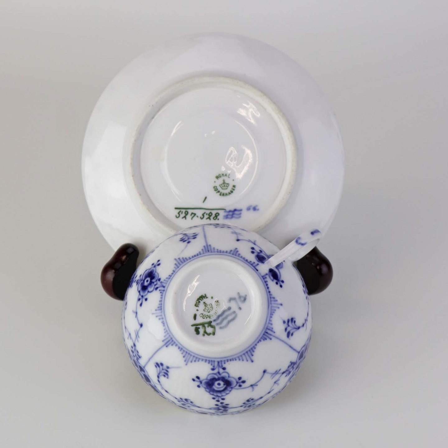 Lille tekop med underkop i kongeligt porcelæn fra stellet Musselmalet Halvblonde. Nr. 1/523 og 1/527-528