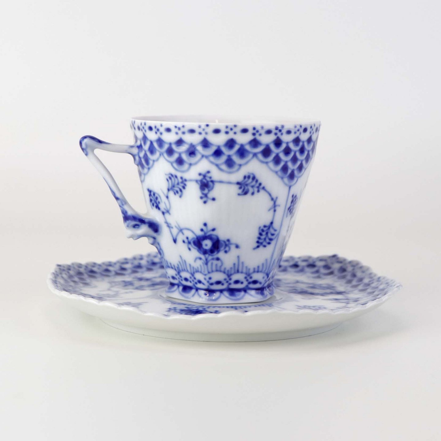 Kaffekop med underkop i kongeligt porcelæn fra stellet Musselmalet Helblonde. Nr. 069 og 1/1036