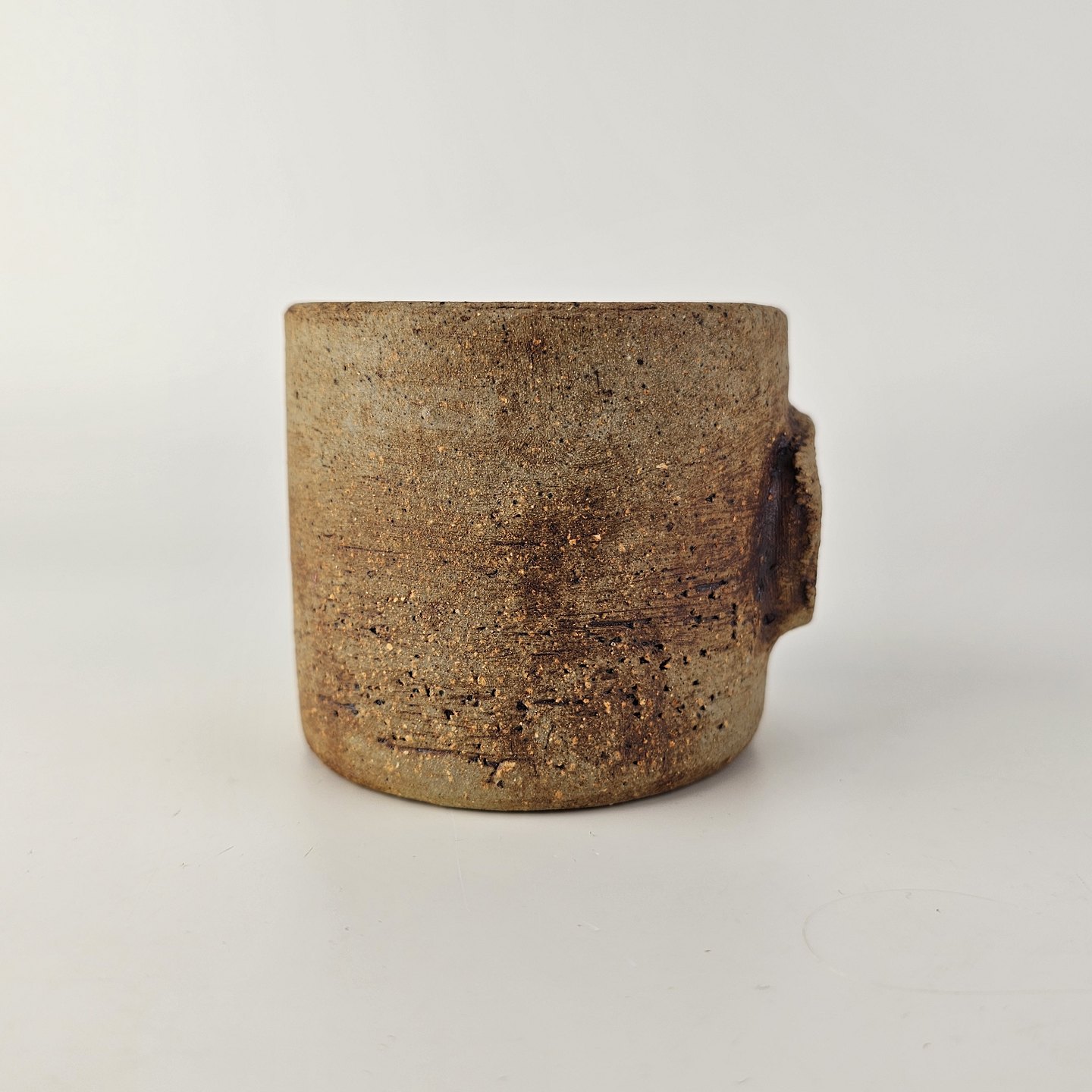 Brunlig krukke, krus, kop, vase med lille relief udvendigt. Den er uglasseret udvendigt