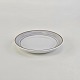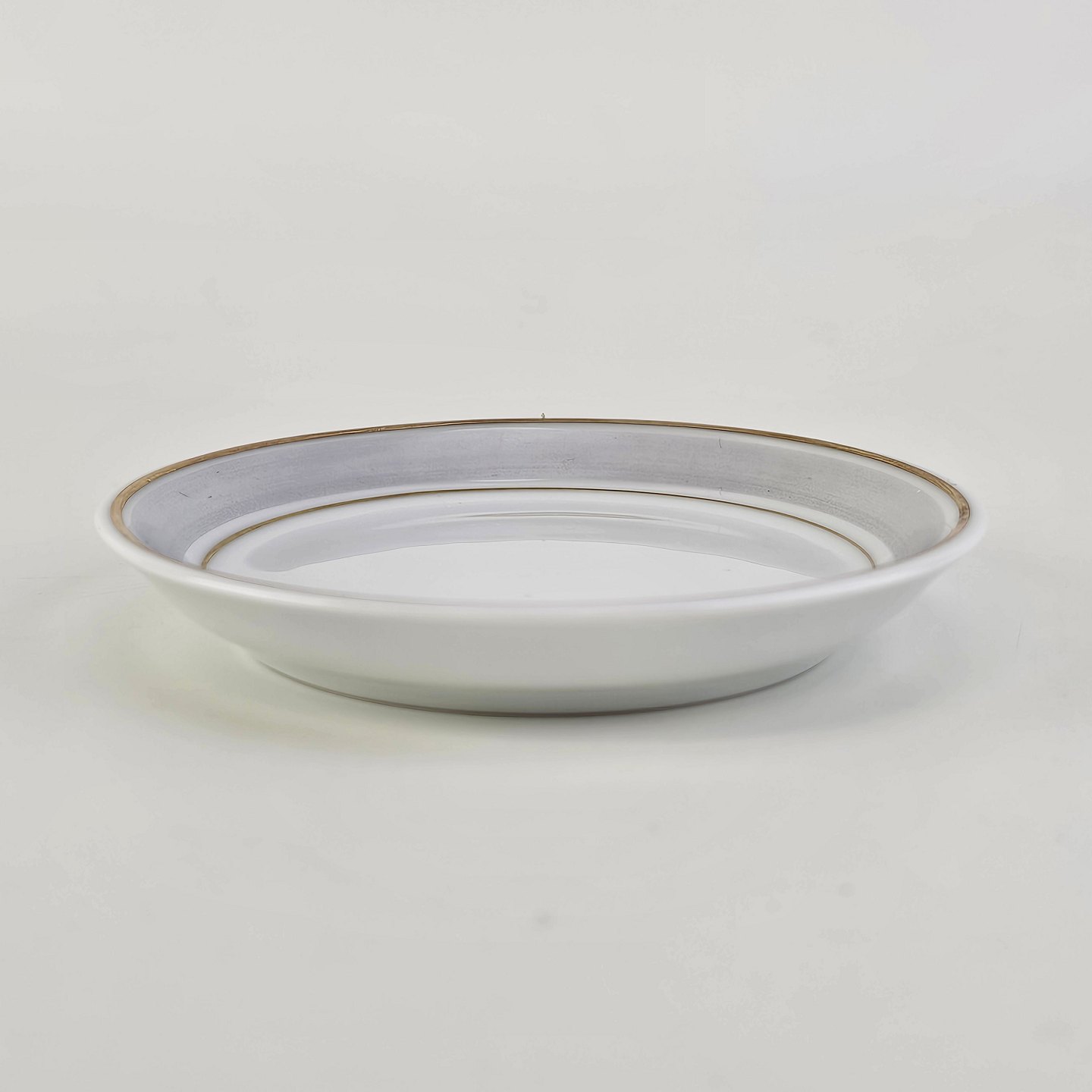 Tiber er stel i glat hvidt porcelæn med grå bort og guldkant