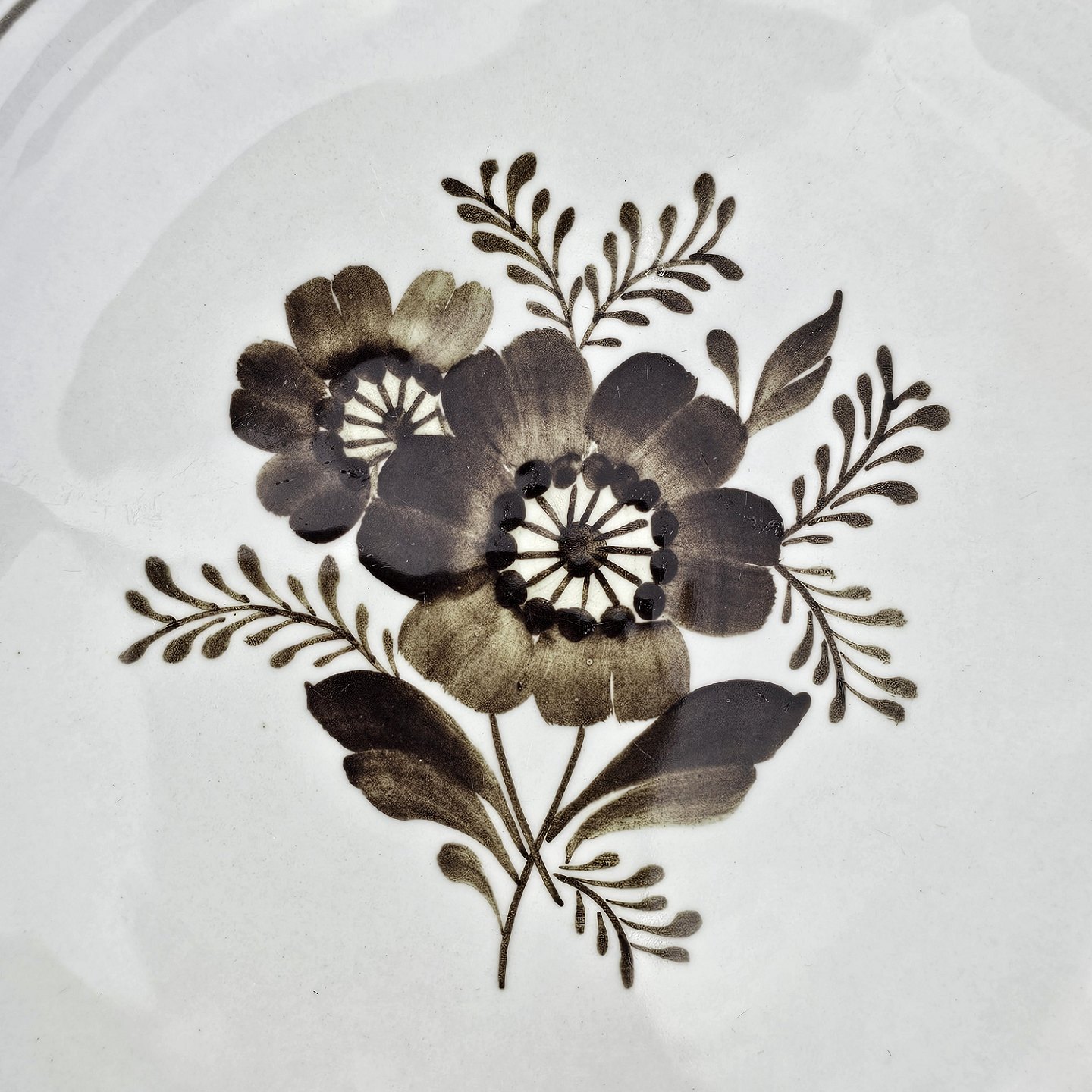 Fajancestellet med flettet kant og dekoration af brune blomster på lys baggrund med brun kant