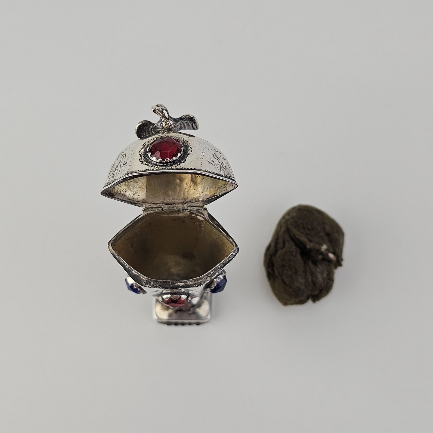 Hovedvandsæg i sølv dekoreret med forskellige smykkesten og en fugl på toppen