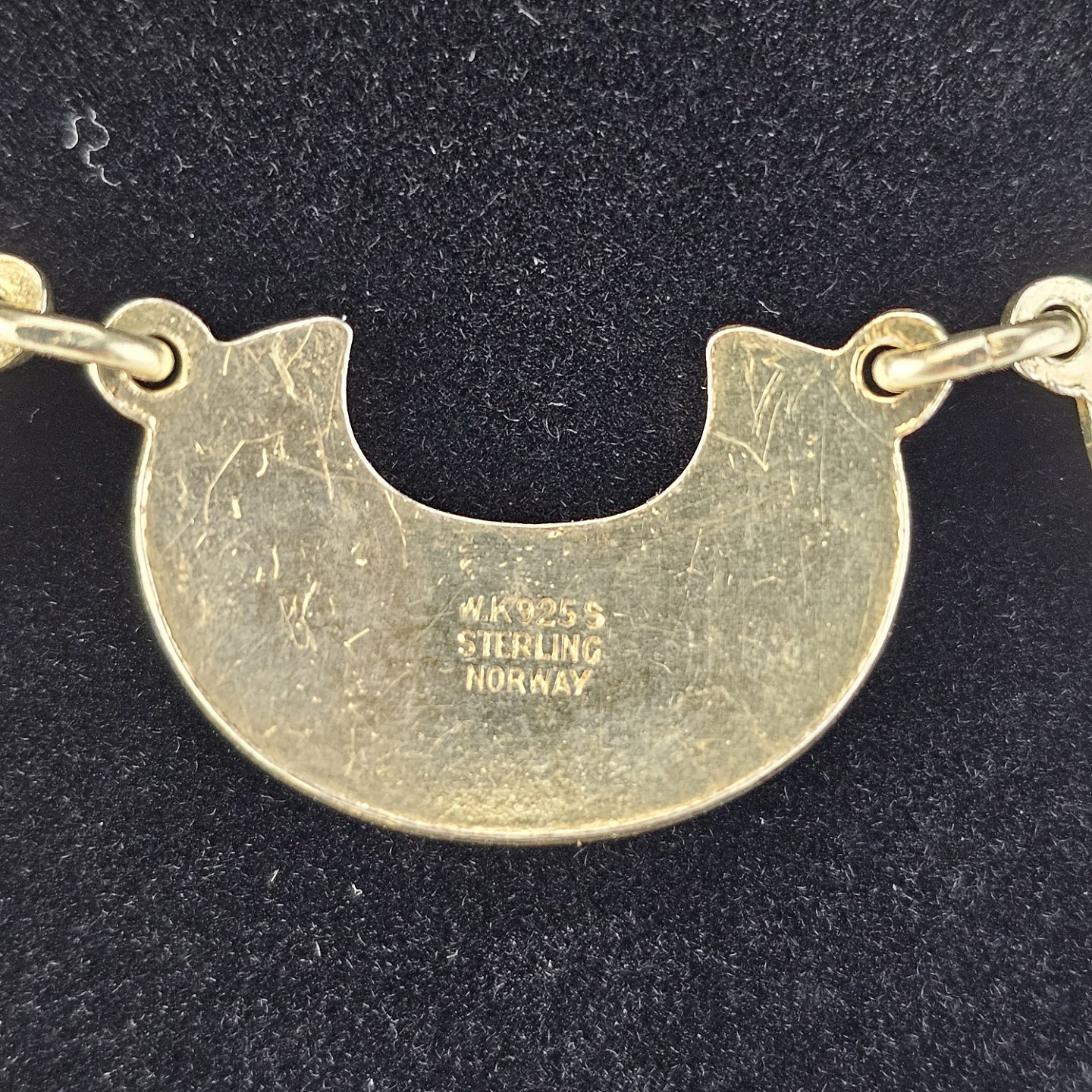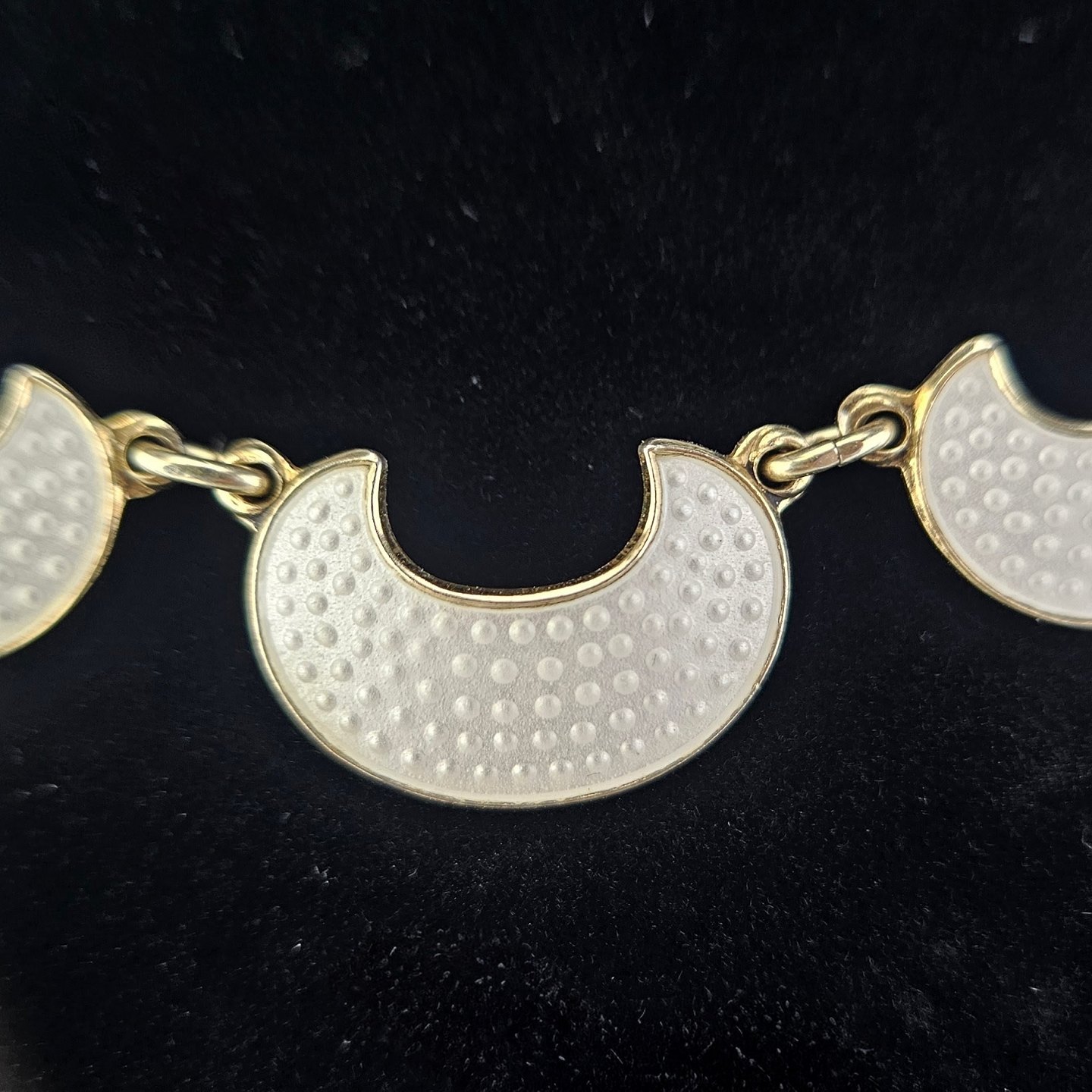 Halskæde i forgyldt sterling sølv med halvmåneformede vedhæng dekoreret med hvid emalje