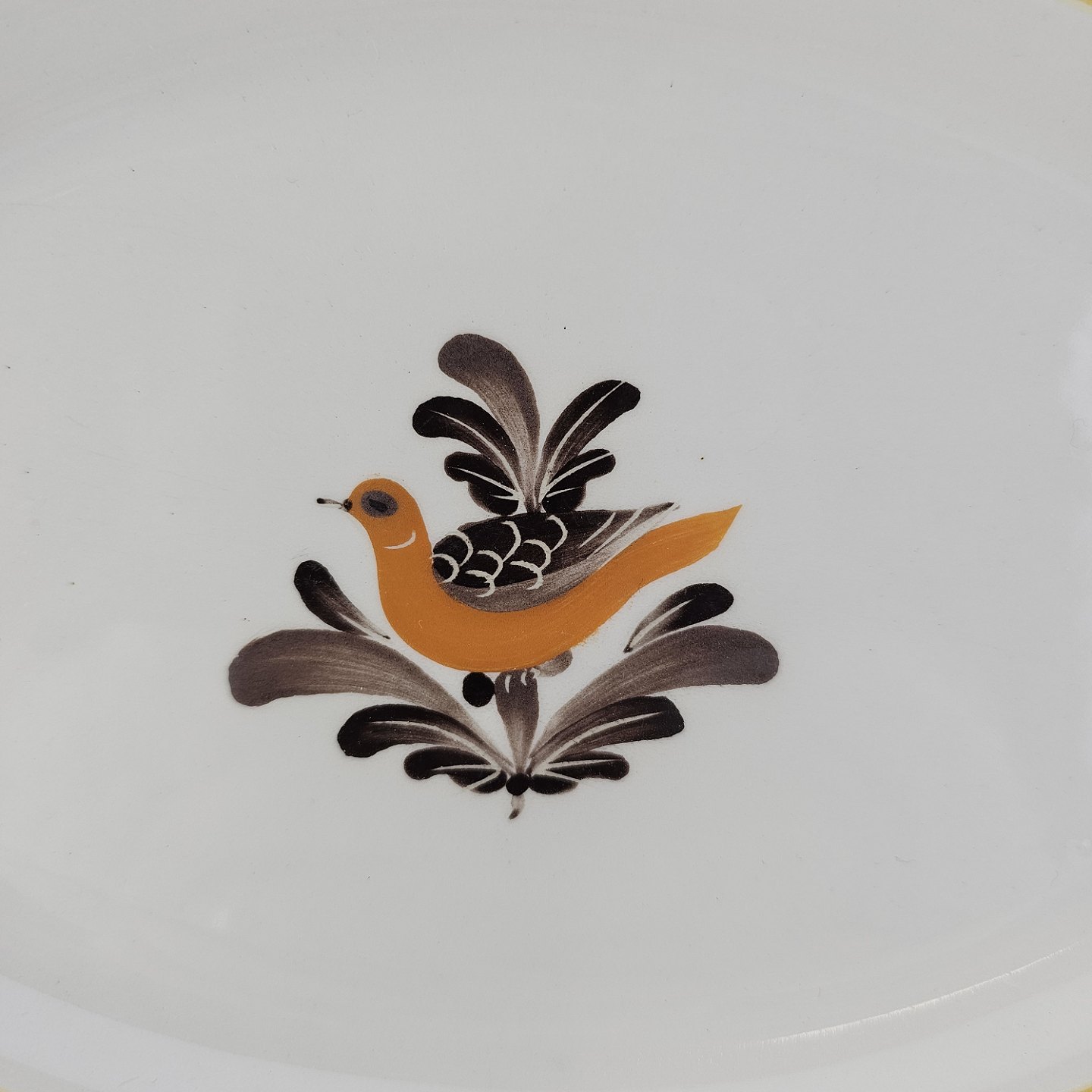 Hvidt fajancestel i stelform G med motiv af en orange og brun fugl og kant.