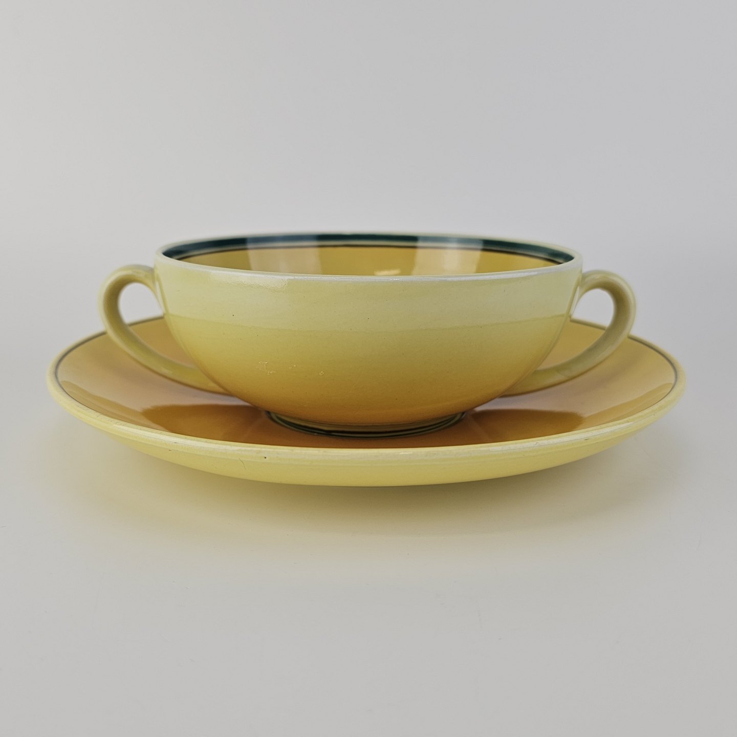 Fajancestel i stelform C med dekoration i gule nuancer med grøn stribe.