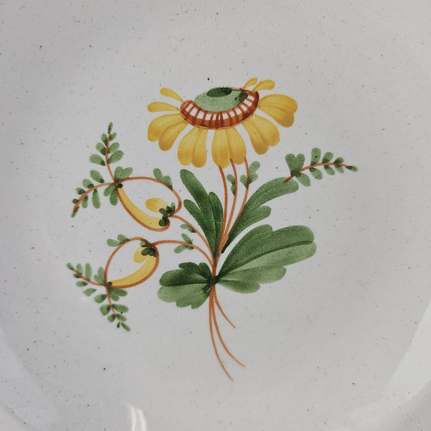 Hvidt fajancestel i stelform Feston/Alma med motiv af gule blomster og grønne blade.